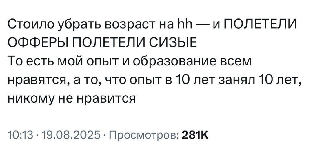 2559 tovaris4777 Юмор Про возраст в резюме... 1 день назад Юмор Жизнь HH Возраст Скриншот X (Twitter) Оффер Образование Опыт 394 57 5 2 1 1 1 1 1 Ещё 4