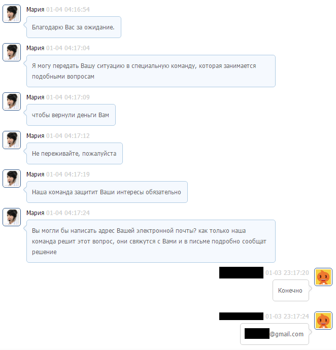 Не сильно продуктивно, вам не кажется? Кстати, забыл упомянуть про второй эпизод общения (сообщение от 2016-12-10). Типовой ответ "не в тему" также стал признаком того, что что-то тут не чисто. Чат с поддержкой меня порадовал куда больше.