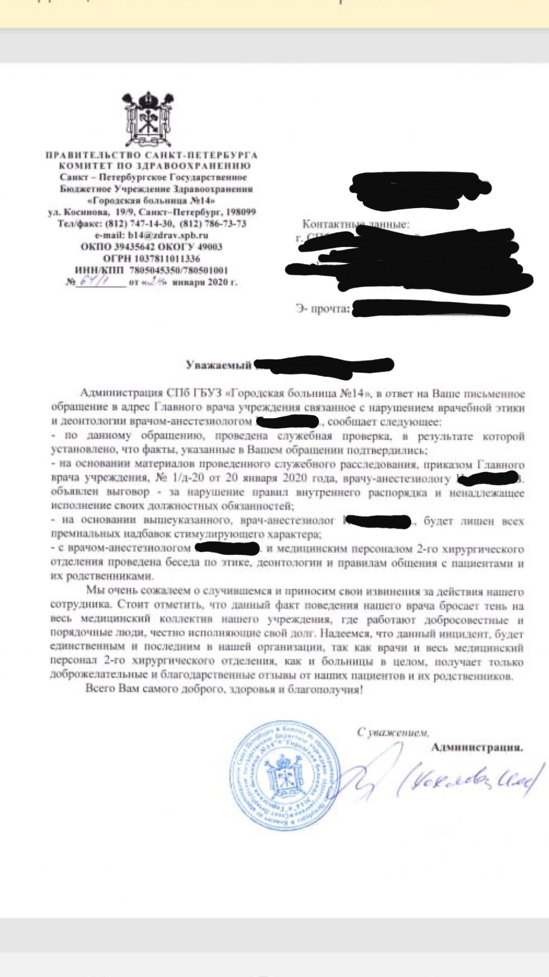 Доброго времени суток! Три недели назад пост выложил о неподобающем поведении одного анестезиолога в отношении пациента. Была жалоба на этого врача написана. И, собственно, все закончилось благополучно. Помимо полученного официального ответа, друг ещё и в платной палате бесплатно отлежал. Сказали компенсация за неудобства. Как по моему, так адекватно и справедливо отреагировали в администрации больницы!