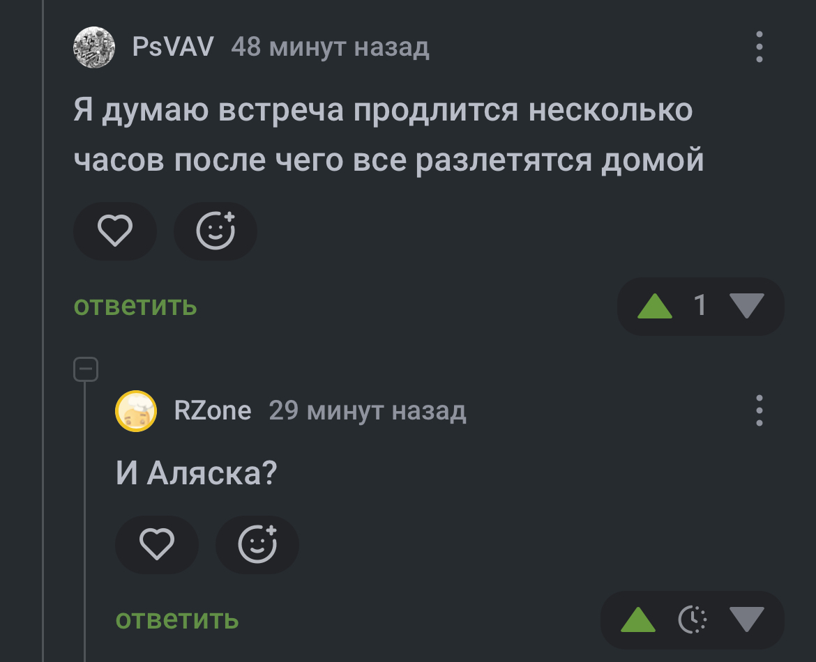 1506 valyndrik Про встречу на Аляске: и фужерчики2 5 месяцев назад Ссыль #comment_362864898 Политика Переговоры Аляска Владимир Путин Комментарии на Пикабу Скриншот 146 32 3 2 1 Ещё 0