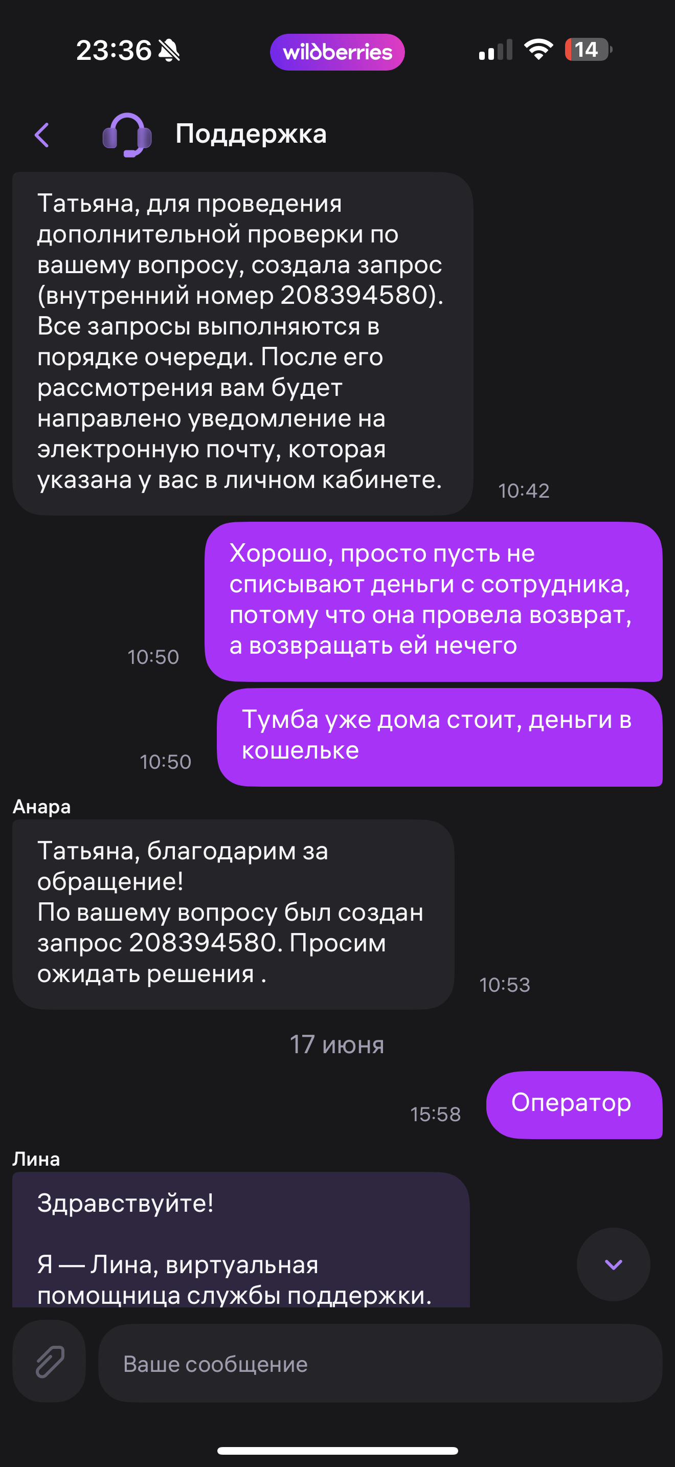 Я подумала, что сотрудница выдачи по запаре случайно нажала возврат вместо выдачи. Решила написать в поддержку, чтобы деньги таки списали, слышала, что в таких случаях списывают деньги с сотрудника.