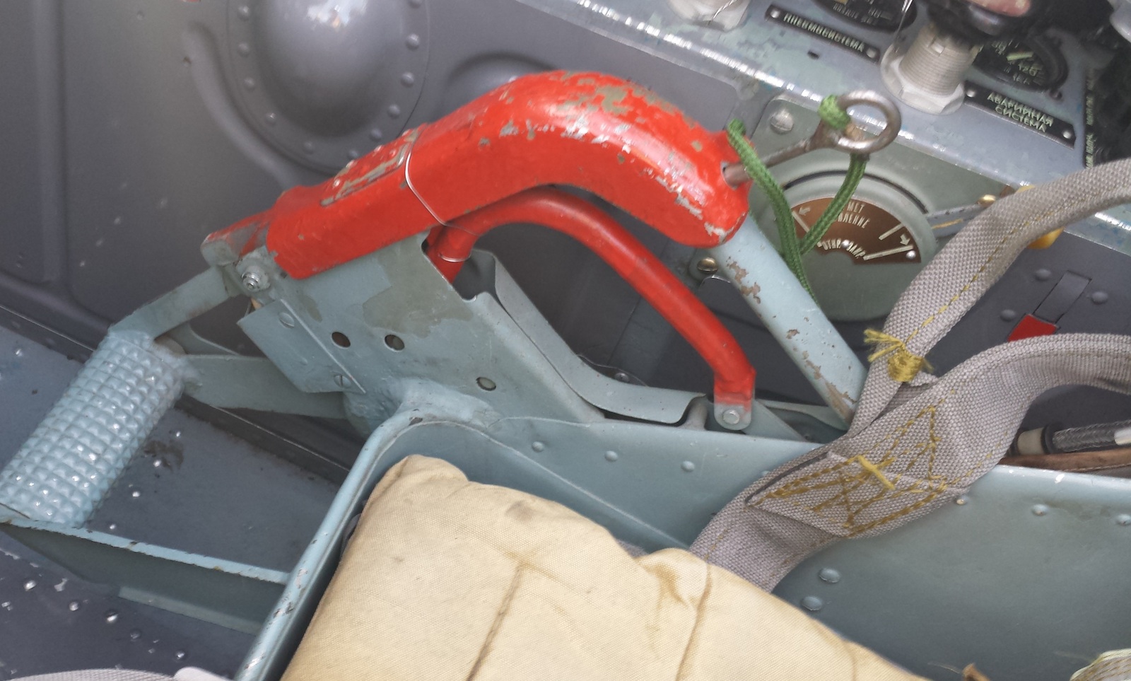 А вот вне кабины уже не совсем... Вот кто-то долбанул самолет о землю и стойкой пробил крыло механический указатель выпуска шасси. Шасси выпущено - штырек торчит вверх.