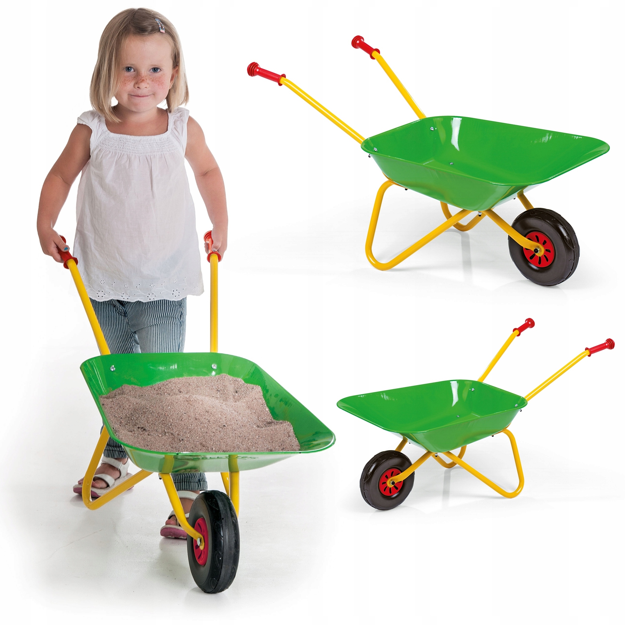 "Тележка садовая" называется, она на двух колёсах, поднимать и держать не нужно, только тянуть или толкать. Если по ровной горизонтальной поверхности, то рукам не тяжело и всем под силу. В разумных пределах нагруженное.