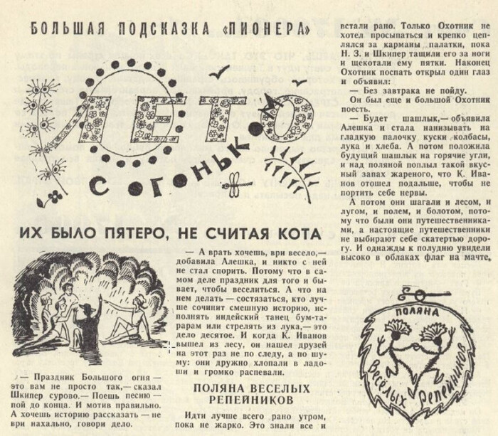 Текст Людмилы Матвеевой "Лето с огоньком", жанр которого я до сих пор не возьмусь определить - приключения Шкипера, Алешки (это девушка), Н.З., Охотника и К. Иванова, щедро пересыпанные справочными сведениями, выкройками, играми и, сегодня бы сказали, лайфхаками.