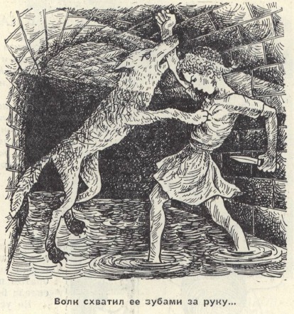 "Клю-Клю ударила волка ножом в горло, а волк схватил ее зубами за руку. Клю-Клю быстро переложила нож в другую руку и снова бросилась на волка. А он отпустил ее руку, нагнул морду и уже готов был вцепиться зубами ей в живот. И тогда все было бы кончено.