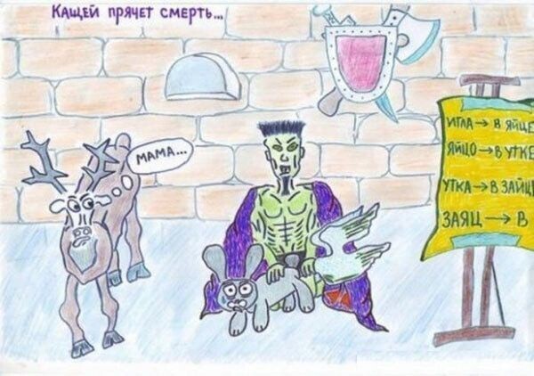 Игла в яйце, яйцо в утке, утка в зайце, заяц в шоке.