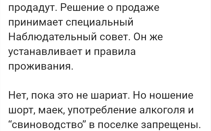 А вообще, непонятно, из за чего буча. Ну хотят мусульмане при деньгах жить компактной общинкой со своими единомышленниками - ну пусть живут, чо, если никому мешать не собираются - Аллах им в помощь, лишь бы законы Российской Федерации не нарушали.