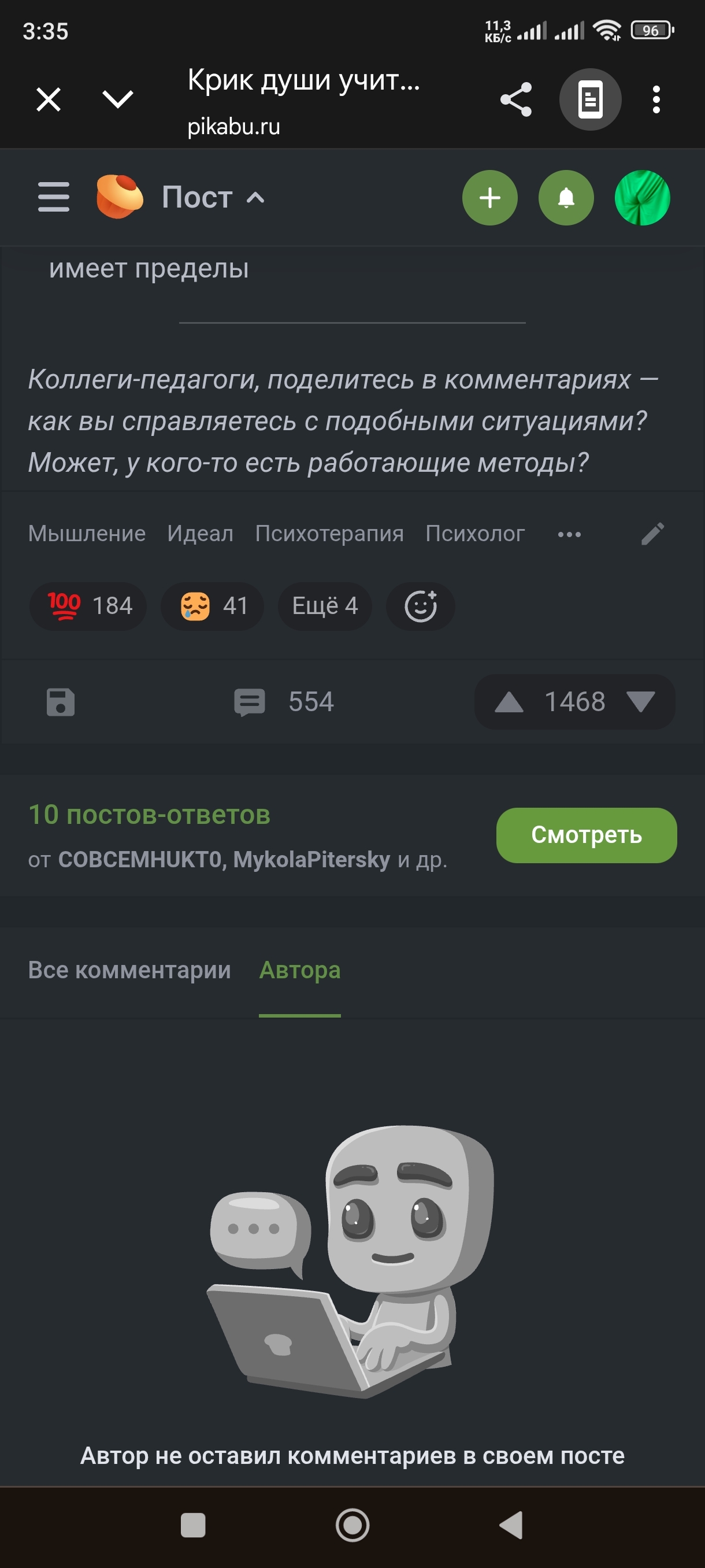 Дано: автор, публикующий посты аки конвейер. Все его тексты имеют подозрительно одинаковую структуру, большинство помечены тегом "моё", но не помечены "контентом нейросетей". В одной публикации, справедливости ради, пикабутяне добились таки соответствующей пометки. Кроме того, в постах постоянно меняется рассказчик, его возраст, пол, профессия, социальное положение. Кроме того, почти во всех постах просьба "поделиться опытом", для нагрева комментов, очевидно. Но нет ни одного комментария автора ни в одной публикации.