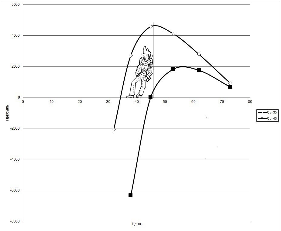 Возьмём два значения переменных затрат, большое и маленькое, и посмотрим, как повлияют они на цену, при которой будет получена наибольшая прибыль.