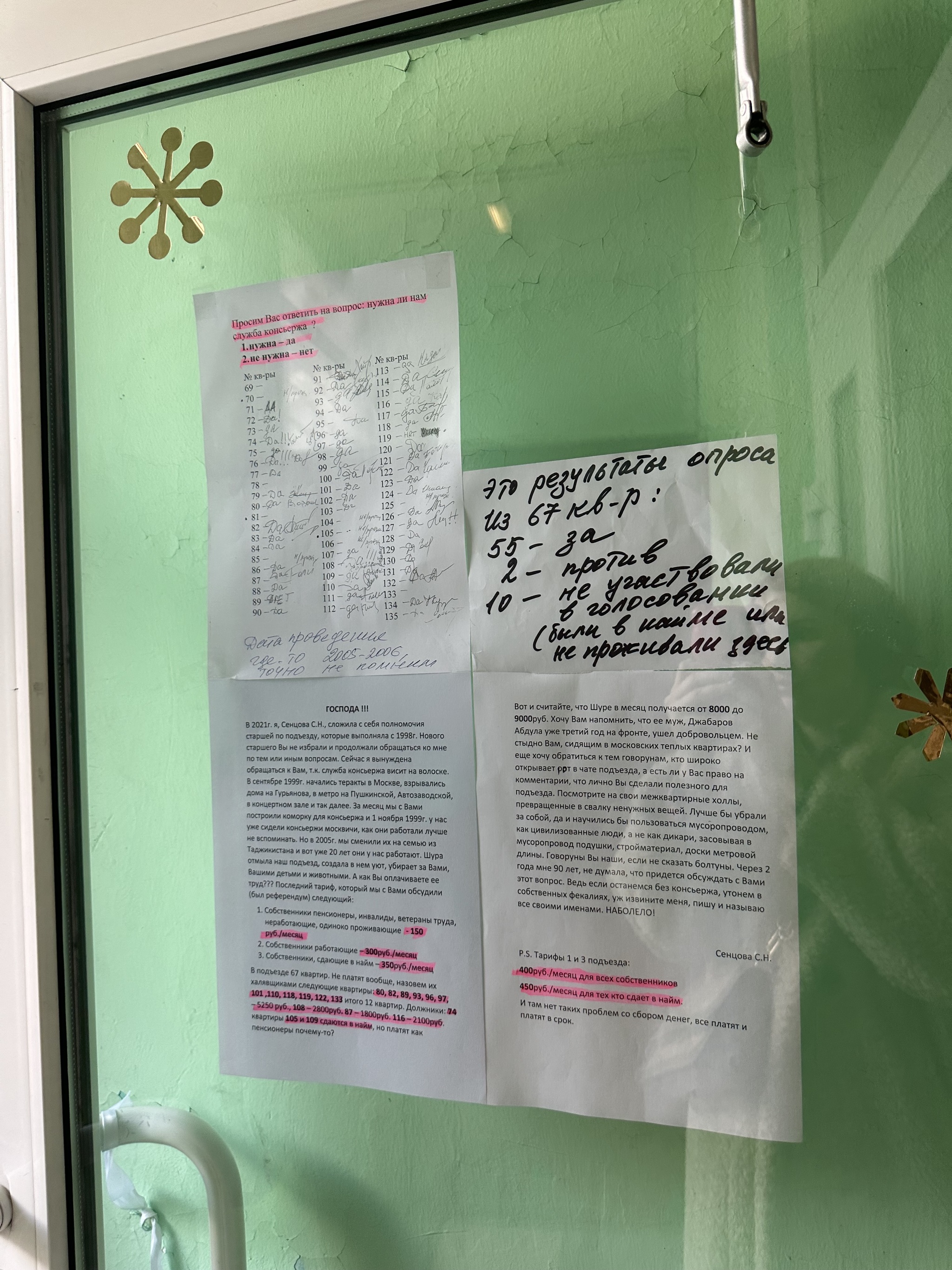 Естественно, более молодые жильцы, которые не согласны с дедовщиной, начали возмущаться. Я предложила оформить консьержа официально, чтобы платили все через платежку, но бабки начали вонять, мол они не хотят платить по 800₽. Короче, типичная ситуация, когда сами все официально делать не хотят, чтобы своей же любимой консьержке зп поднять, а пытаются вывезти за чужой счет. Эти листы начали жители срывать, но получали наказание, а именно вывешивание своих квартир на доску позора.