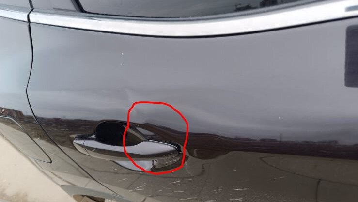 Конечно, для меня, как человека далекого от всего этого, удивительно, что, пусть и много, но относительно небольших вмятин невозможно отремонтировать. Вероятно страховая рассуждает также. Я так понял, что основная беда - расположение этих вмятин вокруг ручки, при открытии металл вокруг гуляет. Фото ниже, но на фото очень плохо все видно, так как краска практически не повреждена.