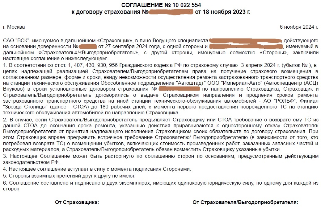 Тем не менее довод даже собственной экспертизы не убедил ВСК в необходимости замены двери и 6 ноября мне на почту приходит письмо от них с информацией, что СТОА Автоштадт отказывается ремонтировать мой авто и предлагают подписать и отправить им следующее соглашение о смене СТОА: