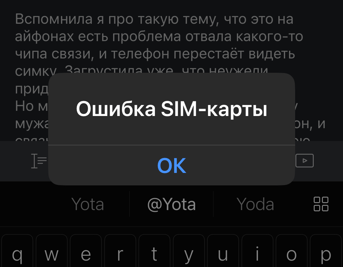 Но мы решили проверить: взяла симку у мужа с теле2, поставила к себе в телефон, и связь тут же появилась без проблем. Мою же йотовскую воткнули ему в телефон - она там тоже показала ошибку.
