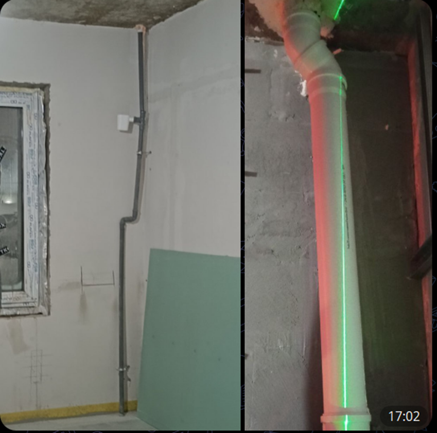 Ввиду несоосности отверстий под канализацию, труба стоит под углом, что приводит к шуму, несмотря на звукоизоляцию и риску прорыва общего канализационного стояка тут, на первом этаже 13ти этажного панельного дома. Такая же ситуация с дренажом для кондиционера. Сдвиг в обоих случаях 11-13 см.