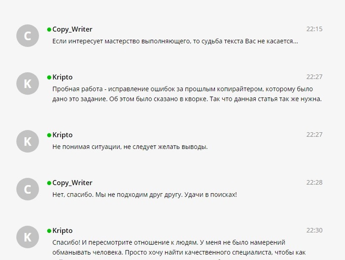 "Пишите пробный текст, нигде не выкладываете, ждёте пока текст будет считаться нашим" - и вы сразу знаете, что через 10 дней вы пойдёте понуро нахуй, и без оплаты проделанной работы.