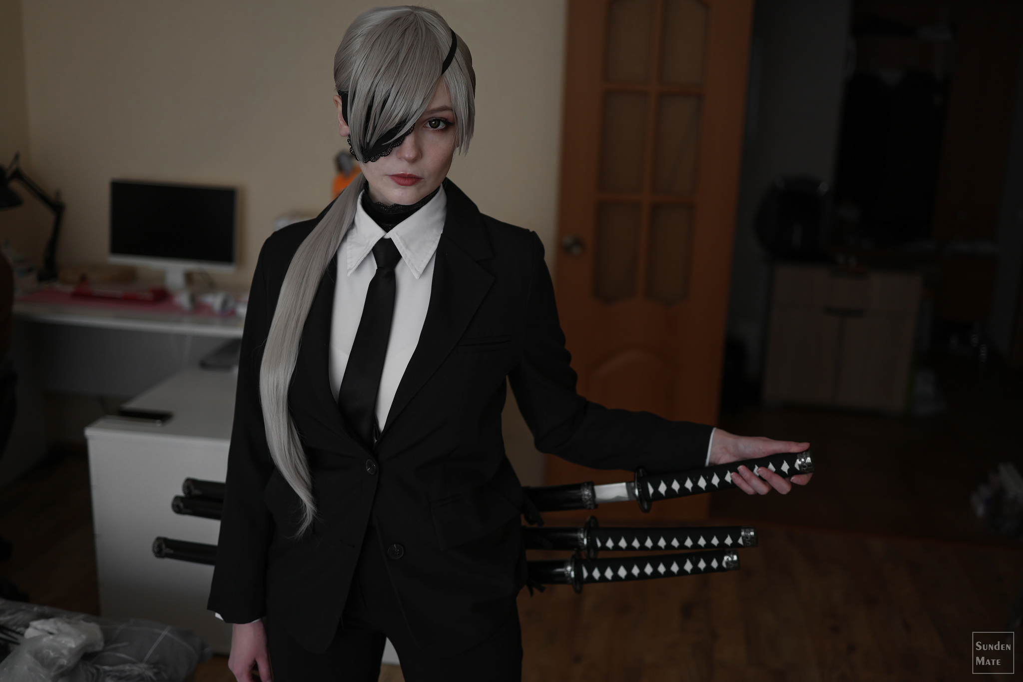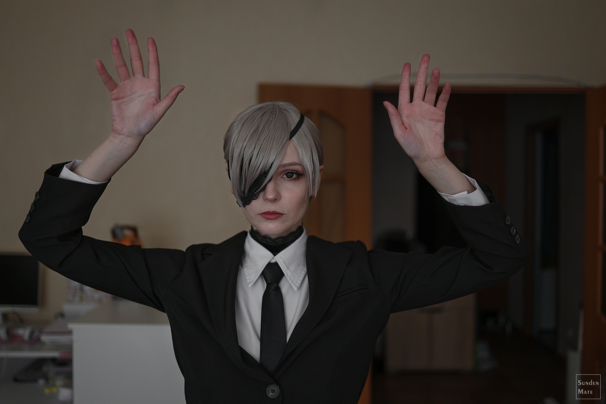 Я решила совместить версию из "первого" и "второго" сезона манги, выбрав ей классический костюм и вооружив тремя катанами, вместо мечей дао. Выбрала супер-тёмные карие линзы, которые больше отдают чёрным, с риском не попасть в цвет глаз, который будет в экранизации. Но я ориентируюсь на мангу, поэтому каноном являются карие глаза.