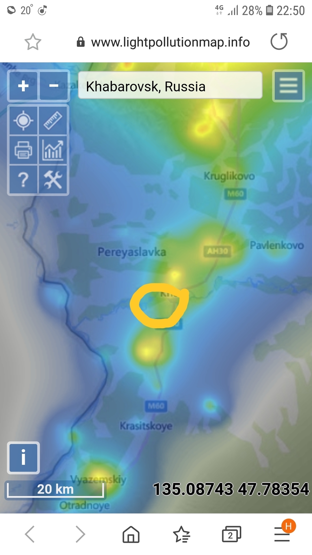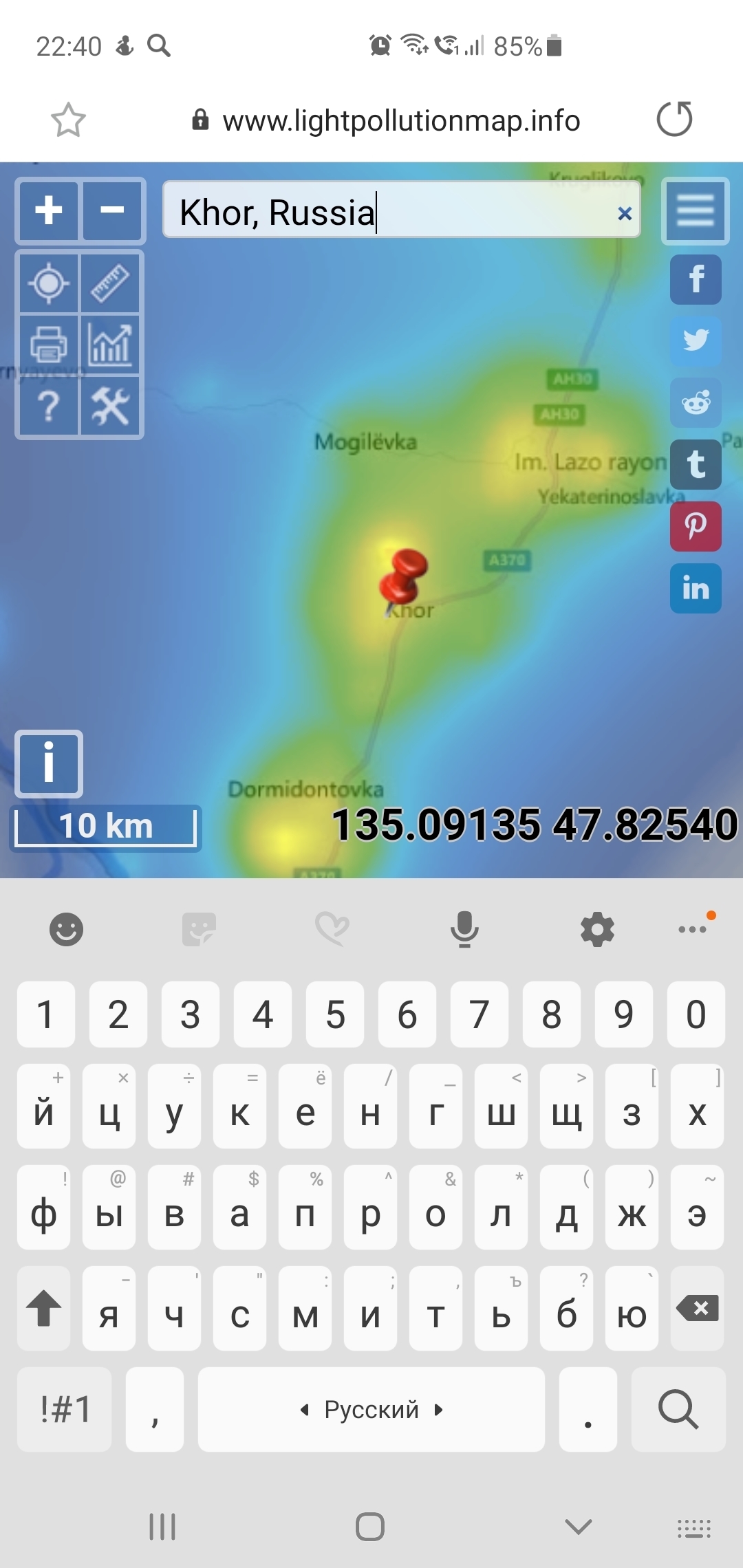 возле озера Гасси Нанайского района Хабаровского края. Поехали именно туда, потому что судя по карте засветки её там не должно быть ) Конечно, место не самое удачное, т.к. рядом с трассой и часто проезжают автомобили, давая вспышки фар на горизонте. Но если забрести куда-то в поле, наверное, будет лучше)