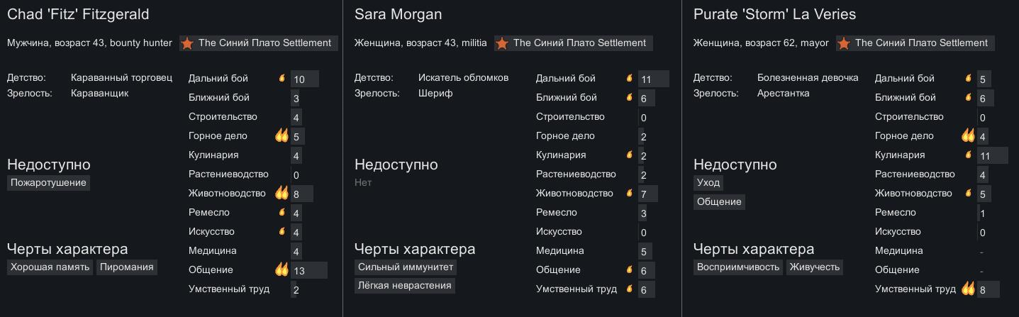 Только сейчас заметил, что новый поселенец имеет постоянный дебаф к настроению на -12 единиц, один из пленников, которого я скоро "приручу" тоже на -6. Будут больше балластом, чем пользой, ну лишь бы не матерились на других поселенцев и не портили имущество. До развлечений мне еще далеко и они тоже скрыты за всякими исследованиями или просто недоступны. Покупку зомбоящика, телескопа или покерного стола я не могу себе позволить, пиво выращивать нет ресурсов. Ну, я сам себе придумал сложности.