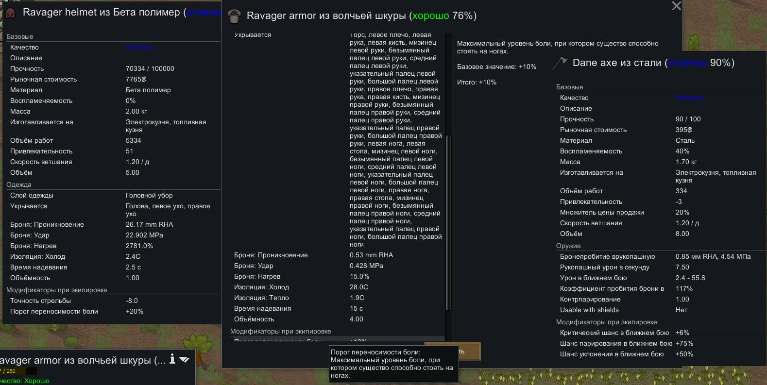 Пришло уведомление, что нельзя ставить мебель в монументе. Ой-ой, извините, сейчас уберу, но на ночь снова поставлю. Hans не смог приручить рысь и чуть не помер. Что уж я там про варга заикался, хотя в первые дни после высадки он смог приручить одного. Напали 7 бандитов с пистолетами, берут осаду – строят минометы и прочее. Хорошо хоть бойцов у меня стало чуть больше. Только сейчас заметил, что один из тех двух бомжей с топорами был очень хорошо вооружен и бронирован – его шмот так до сих пор валяется на рисовом поле. Обратите внимание на прочность и стоимость шлема. Что же я раньше не посмотрел, что там лежит!? Одену на своего милишника-псайкера Starry, затестим. Как-то не охотно он его одевает, все норовит выронить. Кое-как уговорил его взять топор и пойти драться.