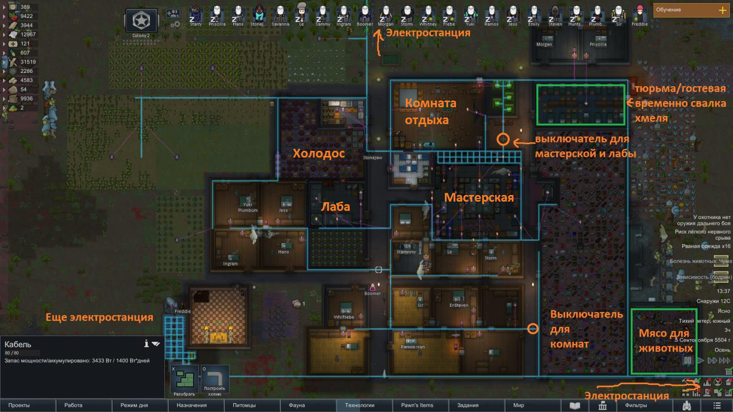 Тем временем я осуществил давний план – поставил переключатели, управляемые часами (Time of day switch из одноименного мода). Получилось сделать так, что мастерская, лаборатория и комната отдыха обесточиваются на ночь, а тем временем другой выключатель автоматически включает освещение и отопление в спальнях. Пришлось, конечно, все это построить – печки, лампы, вентиляцию, перепроложить провода. В процессе не обошлось без казусов, например, разобрал случайно стену холодильника. Конечно, можно обойтись без модов, управлять всем вручную или наплодить электростанций, а потом где-то пропустить и разрядить батареи в 0… Но тут больше мороки, чем удовольствия от игры. Есть моды, которые добавляют электростанции на десятки кВт, но так не интересно. По хардкору надо плодить солнечные и ветряные станции, аккумуляторы и переключать дважды в день все выключатели.