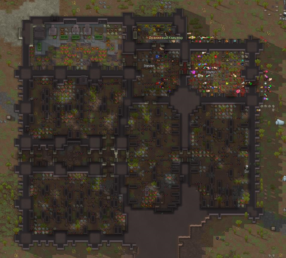 Тем временем заварушка закончилась. Гора трупов, куча раненых. Я думал оборудовать ту гостевую комнату под тюрьму, но у нее нет части стены и она находится в дальней части базы. Выгнал Рамос и Хантсман из комнаты, обозначил по полу спальные места и приказал захватить всех раненых, кроме самых безнадежных. Удалось так же спасти 4 раненых союзников. В общем, полдня микроконтроля – одни лечат, другие носят пленников, еще один – травки. Захватывать там было толком некого, я изначально планировал их вылечить и отпустить. К вечеру ушло уже 10 человек, подняв мне репутацию. Так же у меня забился склад трупами врагов и жуков, а он, на минуточку 11х11. Ну, будет что пожрать зверюшкам, запретил им ходить в "людской" холодильник. Холодос тоже еле закрывается, я где-то просчитался с производством пива и у меня там лежит 300 ед пива и 3000 хмеля – а в какой-то момент не было ничего, я начал активно его выращивать. Гости (верней, недруги) оставили еще 2 сотни пайков. Что делать с сотней стволов даже не знаю. В караван может загрузить? Ой, простите, корован.