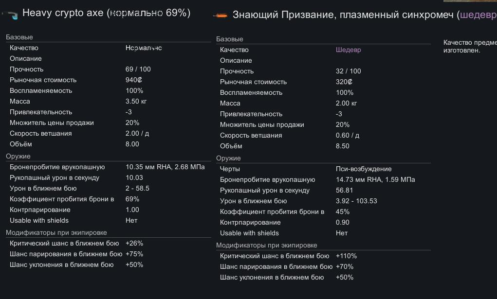 В здании обнаружился ковчег криптосна, в котором был еще один горемыка в знакомой нам броне. Он моментально слег, выронив крипто-топор. Зашифрованный что ли? Характеристики на скрине в сравнении с плазменным синхромечом. Меч, кстати, пора заменить, уже сточился до 32%.