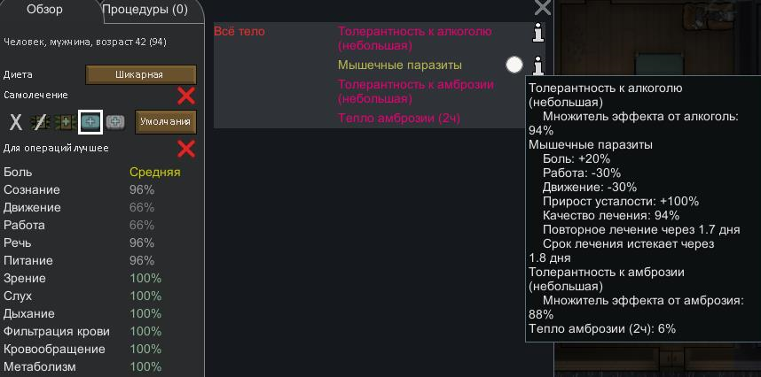 Мышечными паразиты дают неприятные дебаффы, от которых сильно страдает эффективность колониста, он и работает медленнее и вынужден спать в два раза больше. А так же -15 дебафф настроения (-10 за боль, -5 за болезнь), что увеличивает шанс нервного срыва. Лечится только обычными или продвинутыми медикаментами раз в два дня, проходит только после 3-5 лечений при 100% эффективности подряд. Из-за этого у меня закончились медикаменты и ресурсы для их производства, а эффективность производства сильно упала.