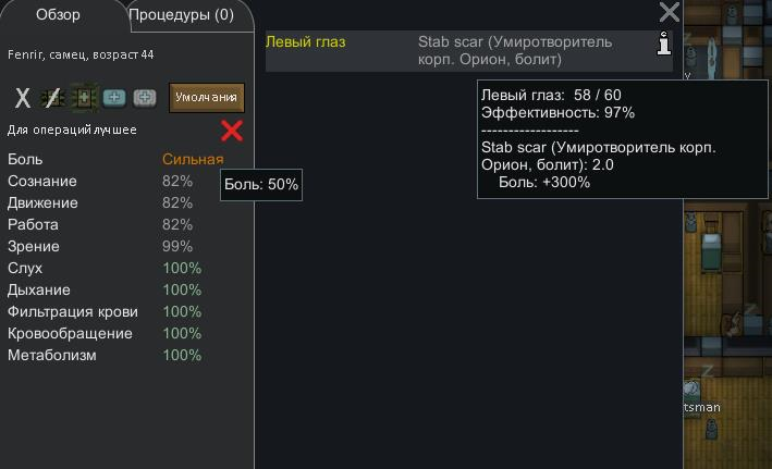 Пришлось смухлевать – я перекрыл 2 бойцами с чудо-ножами улицу и приманил волков туда с помощью Старри и его телепорта. На скрине, кстати, виден волчок, который пришёл ко мне в прошлый раз, но так и не пришёл в себя. Его подкармливают (сами), чтобы он не сдох. К сожалению, мод "A Dog Said…" работает не очень хорошо – я изучил и создал нужные протезы (у него боль в глазу 600%, см 9 Мартомая 5504), но не могу их вживить, своим другим питомцам – тоже. Возможно, конфликт модов. Остальные же прирученные волки чувствуют себя хорошо и как раз сегодня родили мне 2 волчат. Попробую и этих захватить, правда помню какой это гемор. У Ганса висит воодушевление приручения, один точно приручится.