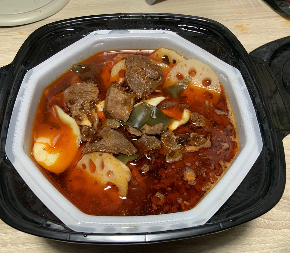 Состав. Посудки Для основого блюда и большая тара. Овощи:Листы орхидеи, Слайсы Бамбука, Водоросли, картошка. Соус сладко томатный. Говядина в своем соку. Вкусная. Но вроде соя хз.