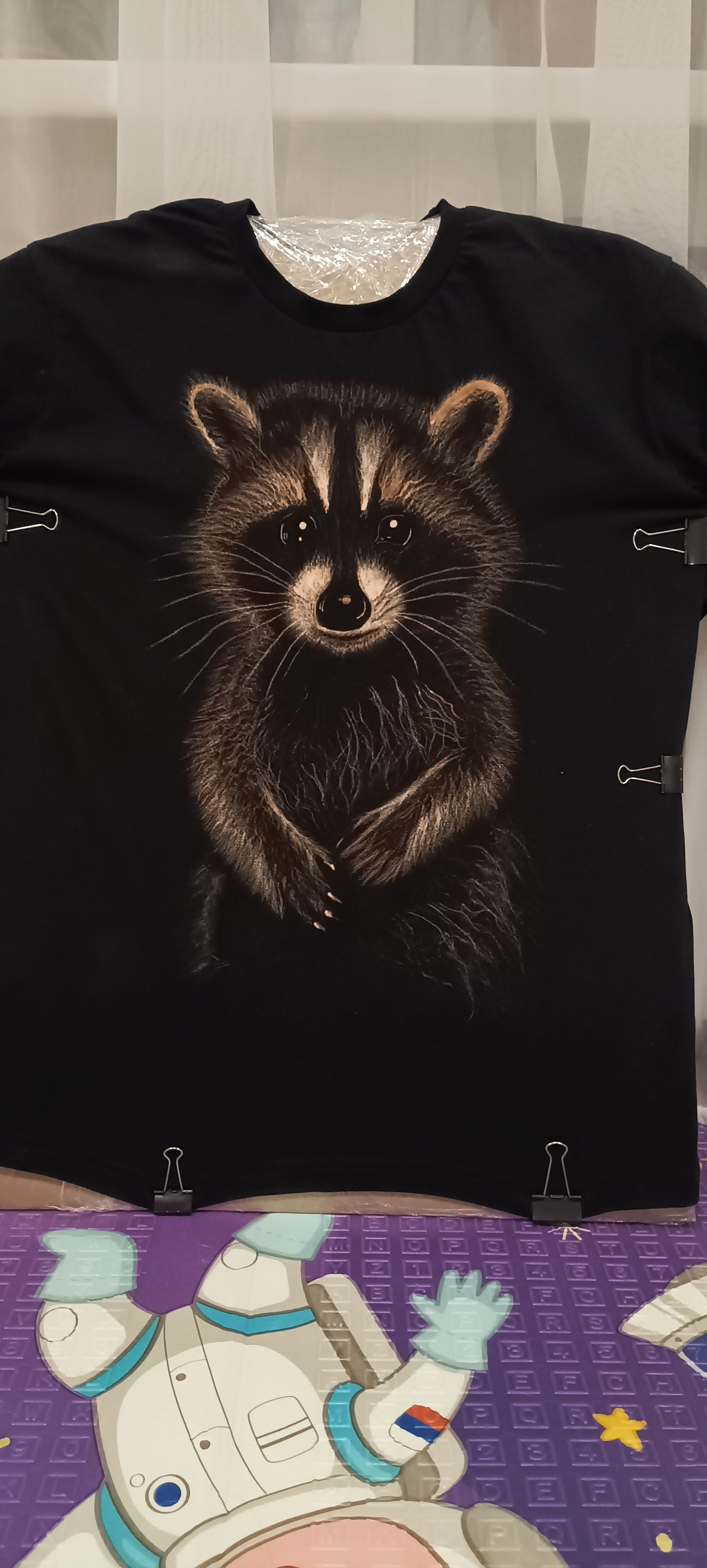Уважаемые пикабушники и все мои подписчики. Всем привет! В сети наткнулся как некоторые творят шедевры, рисуя простым отбеливателем на одежде, решил сам попробовать. Решил выбрать что-то из животного мира, ну и чтоб рисовать особо не сложно было. Первый мой енот получился, как полагается блину- комом. Это второй, где я уже учёл предыдущие ошибки. В общем сам процесс рисования выкладывать не буду, покажу лишь результат. Да, он не такой классный, каким мог бы быть, но для меня это маленькая победа над самим собой вчерашним. Смотрите, умиляйтесь, восхищайтесь, критикуйте!