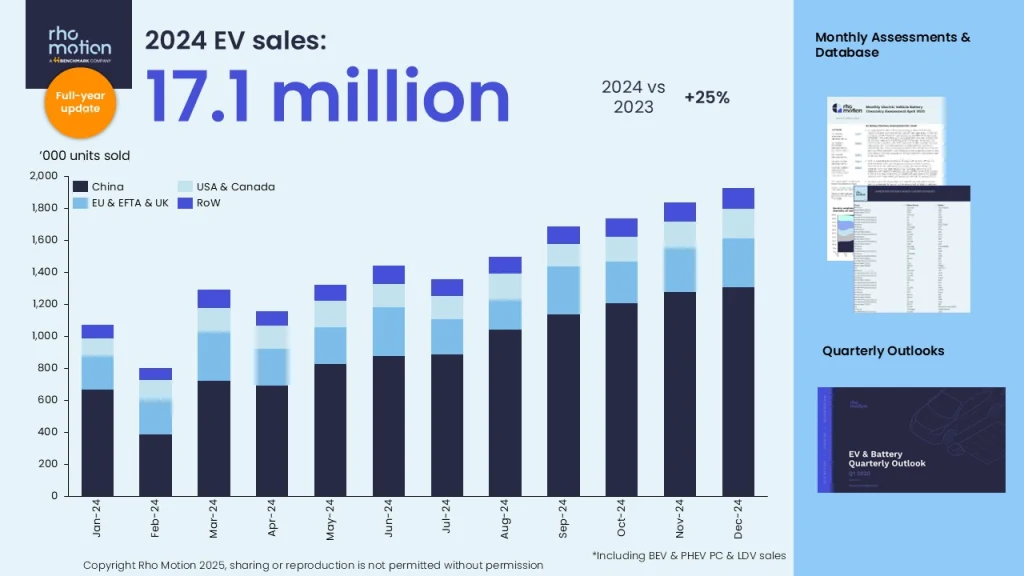 Рост продаж электромобилей продолжается в прошлом году было продано 17,1 млн "электричек" что на 25% больше чем в 2023 году. При этом в декабре 2024 года было продано более 1,9 млн единиц ЭМ, что на 5% больше, чем в предыдущем месяце. По данным аналитического агентства Rho Motion Китай продолжает лидировать в мировых продажах, продажи прибавили рекордные 40% в 2024 году по сравнению с 2023 годом, а еще один месячный рекорд продаж электромобилей был достигнут в декабре 2024 года, когда было продано более 1,3 миллиона единиц.