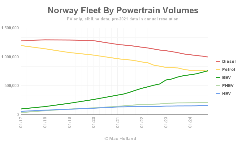 Из интересных фактов напомню что страна занимает первое место по добыче газа в Европе и при этом практически полностью отказалась от использования ископаемого газа в отоплении перейдя на тепловые насосы. В августе продажи топлива для ДВС упали на 6.2% по данным Норвежского статистического агентства SSB.