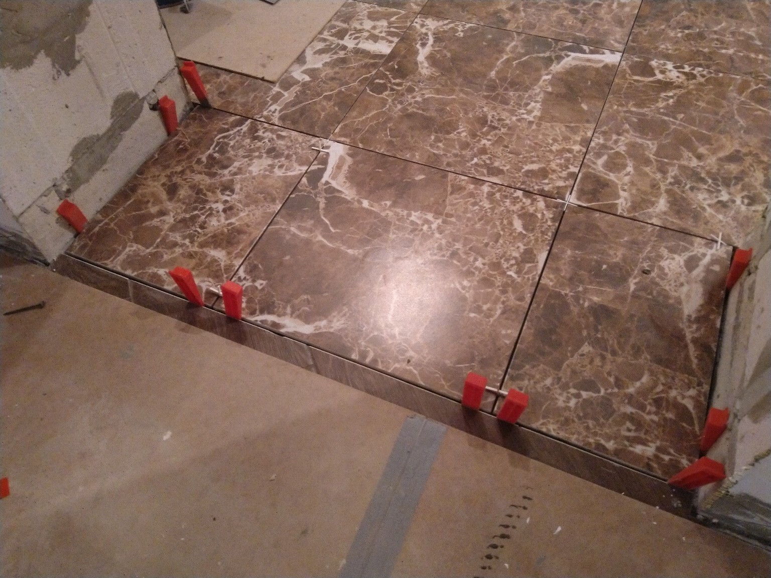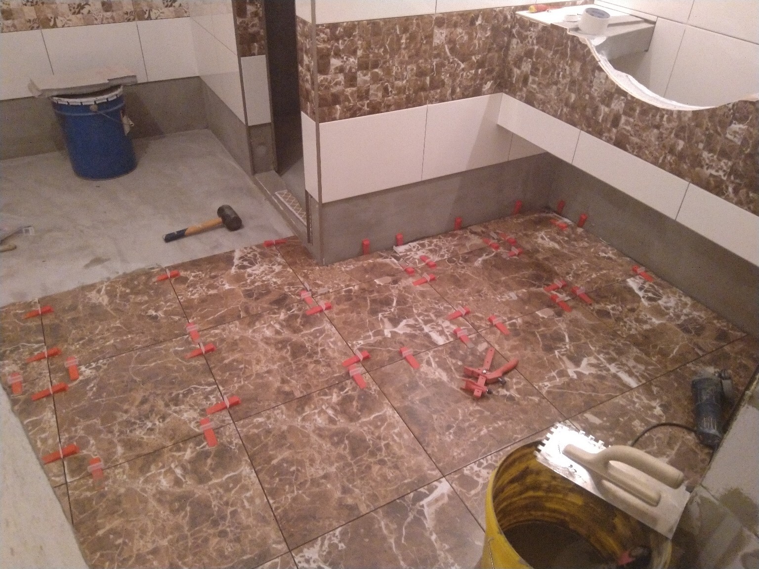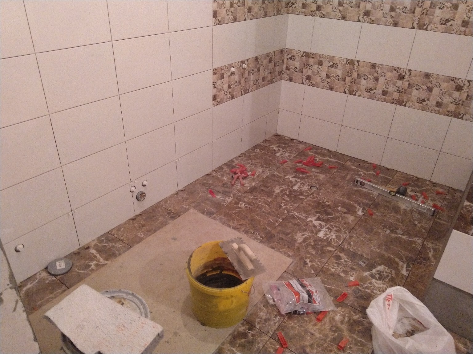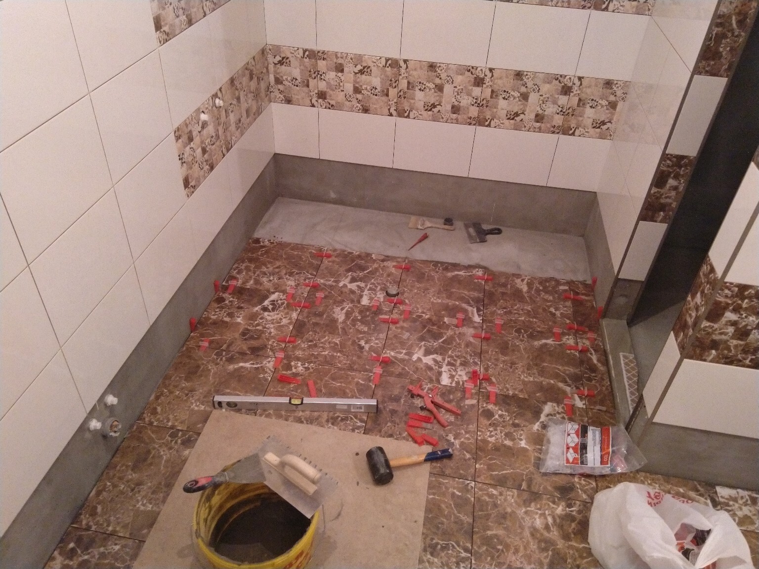 Продолжаю укладывать плитку на пол. Идёт тяжело, дико болят колени и спина, но я не сдаюсь, продолжаю делать по 2-3-4 присеста на каждую плитку). Кажется, что и осталось-то немного совсем.