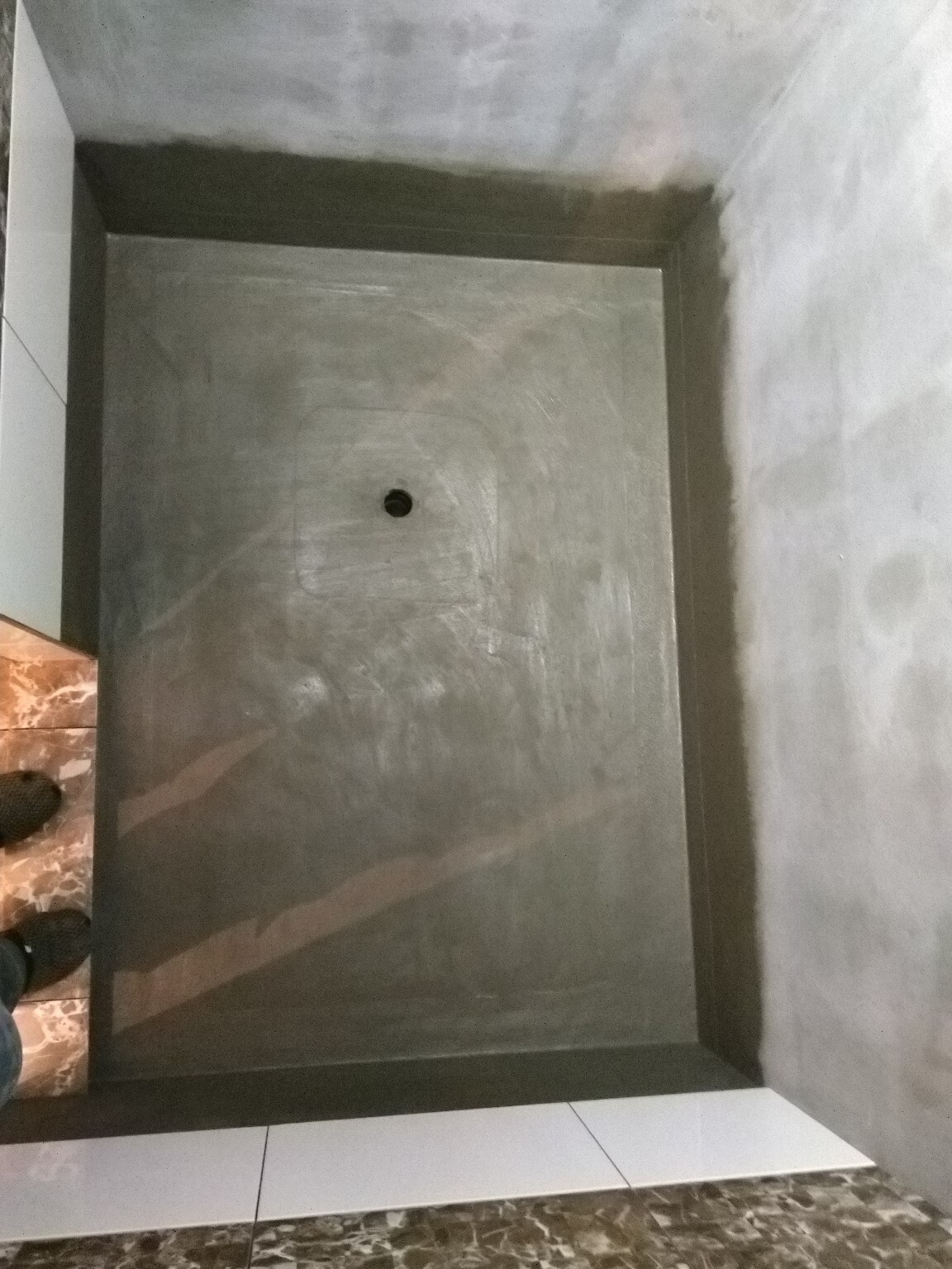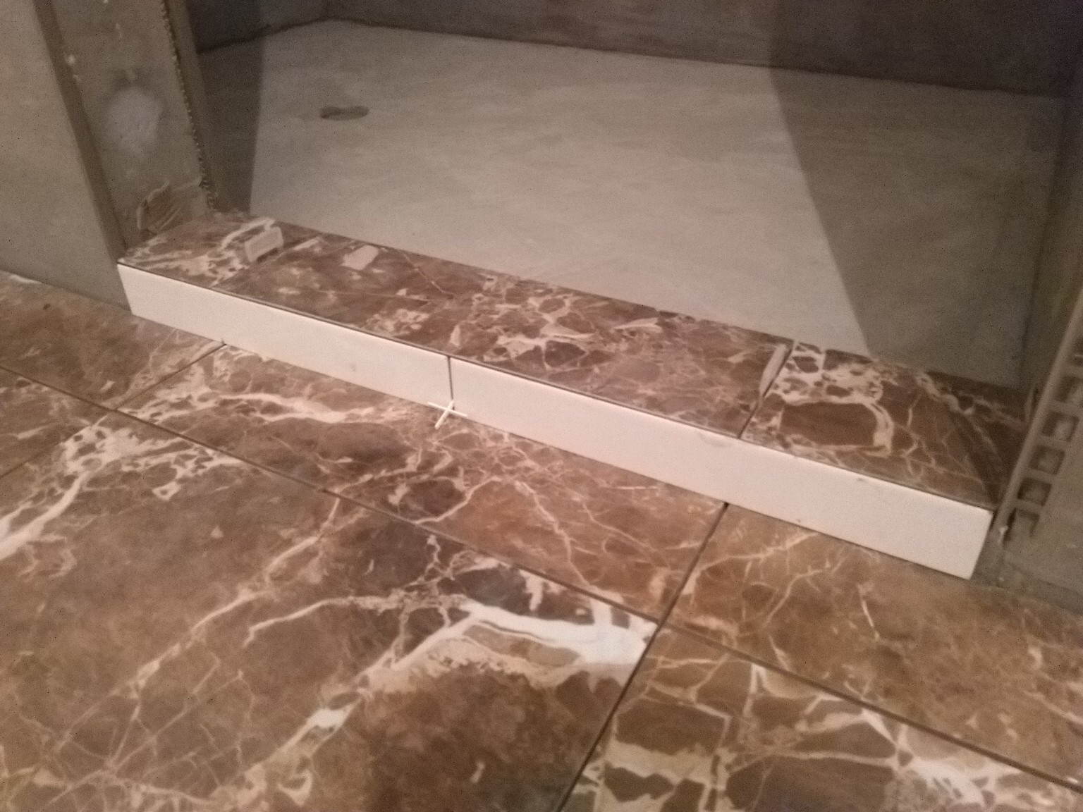 Это облицованный порог в душ. Этим, конечно, сейчас никого не удивишь, но я тут опять заморочился на подрезку углов под 45°. И сделал небольшой уклон в сторону душа.