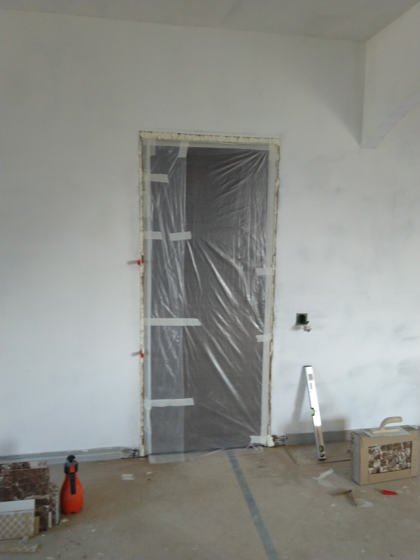 Воткнул первую межкомнатную дверь. Не хотелось по грязи этого делать, но пришлось, т.к. без установленной двери не сделать красиво откосы из ГКЛ, чтобы закончить плитку. Пока идет малярка, несмотря на ежедневные уборки, на моем объекте ужасная грязь и пыль, именно от нее так тщательно защищались полы. И дверь я тоже всю затянул в пленку.