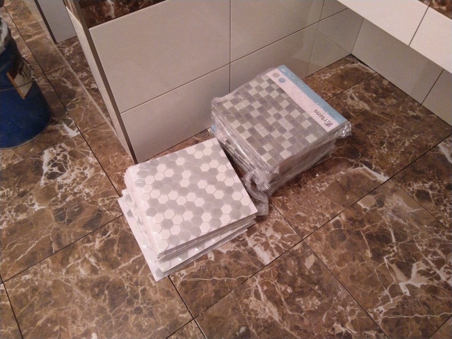 ...и мозаика ждет-не дождётся, когда будет наклеена на пол и стены душа. Ее я привез накануне, целый день мы с супругой шароёбились по строймаркетам, подбирая по бюджету и цветовым предпочтениям.