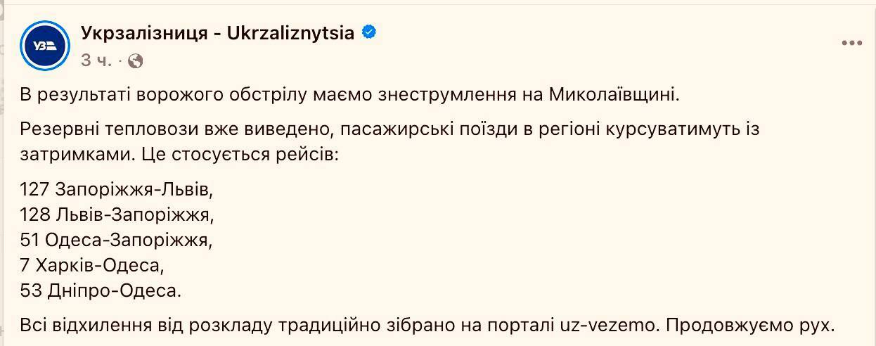 В Николаевской области после ночной атаки обесточена железная дорога, задерживается ряд дальних поездов, а именно: