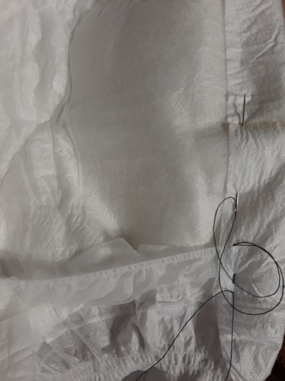 И крупными стежками, заводя иглу за вату, но, чтобы она была перед наружным слоем (чтобы нить не стала фитилем для жидкости и не мочила нижнее белье), прошиваю. Насквозь прокалываю в начале в месте где нет наполнителя и в конце, где уже нет наполнителя. Получается вот так, как на фото ниже (справа черная точка это в начале прокол насквозь в конце на этом снимке не видно)