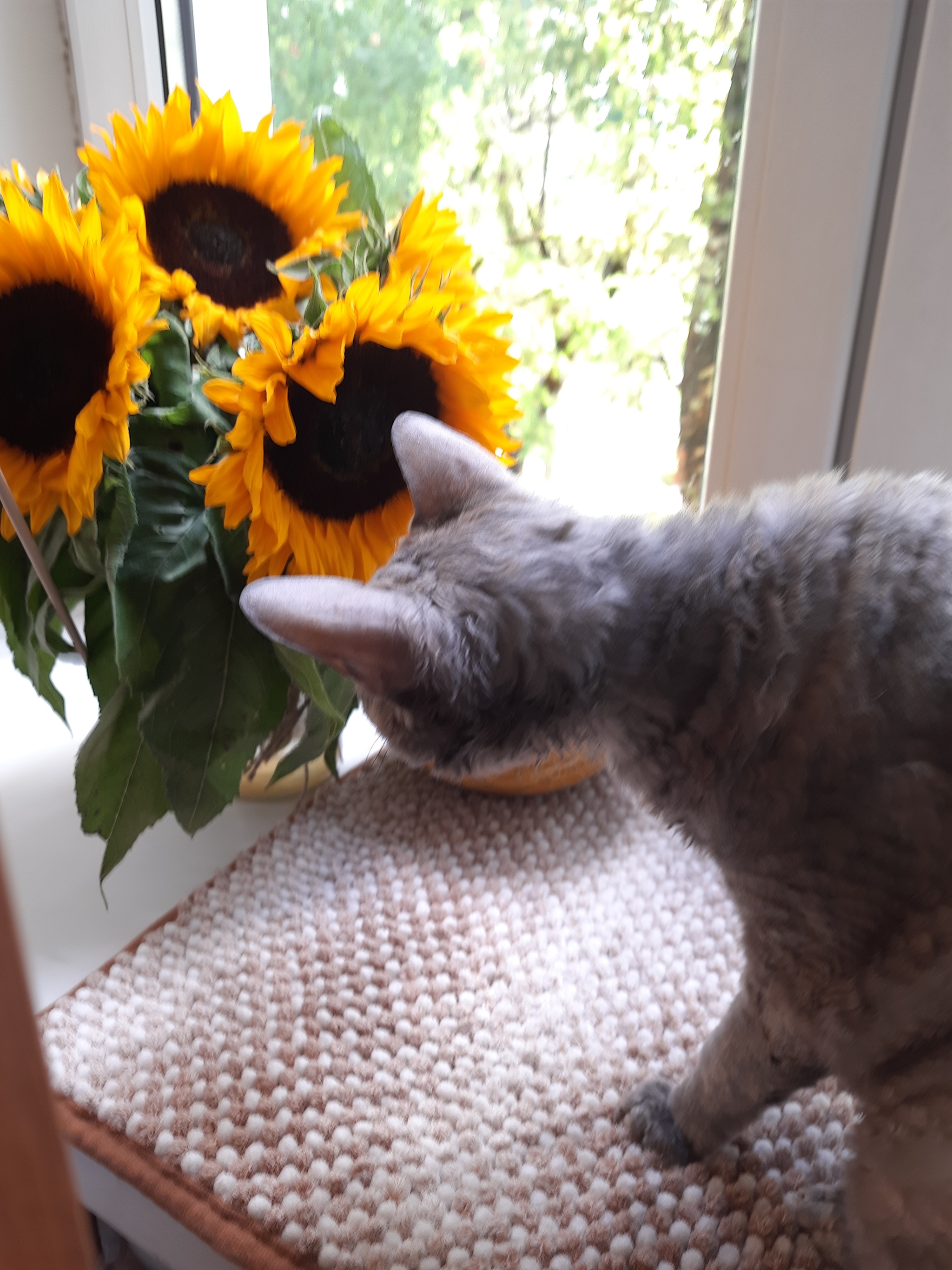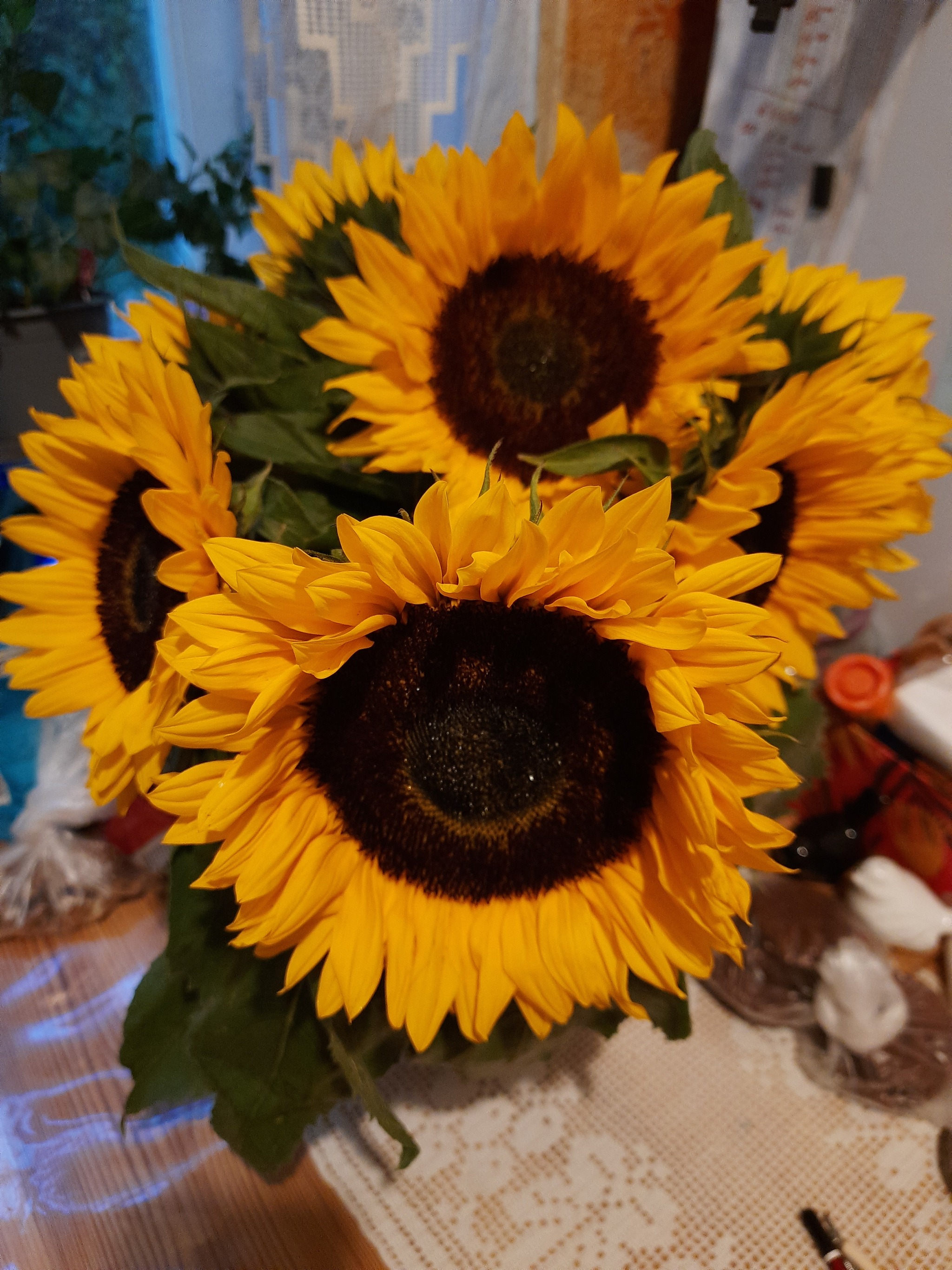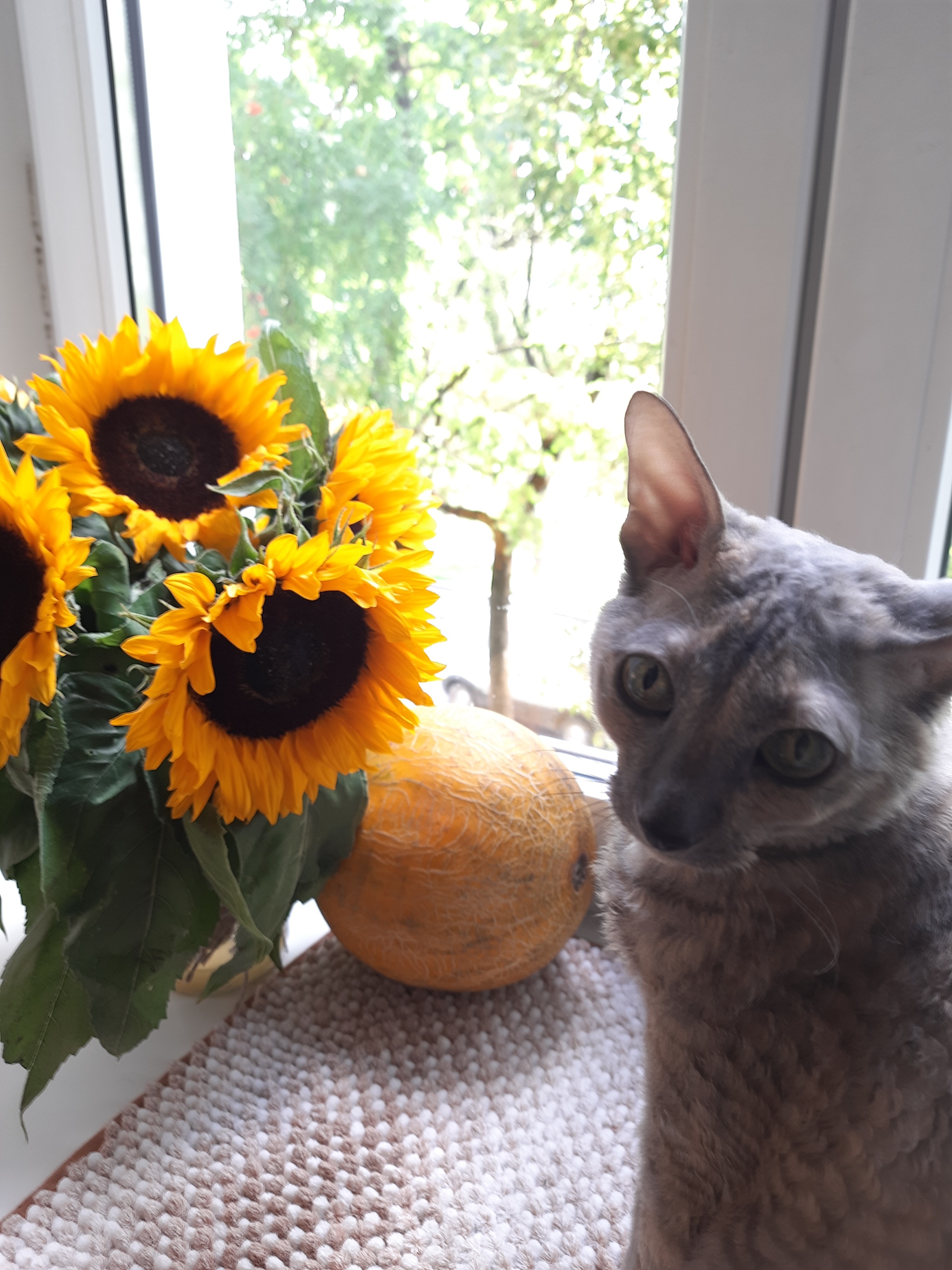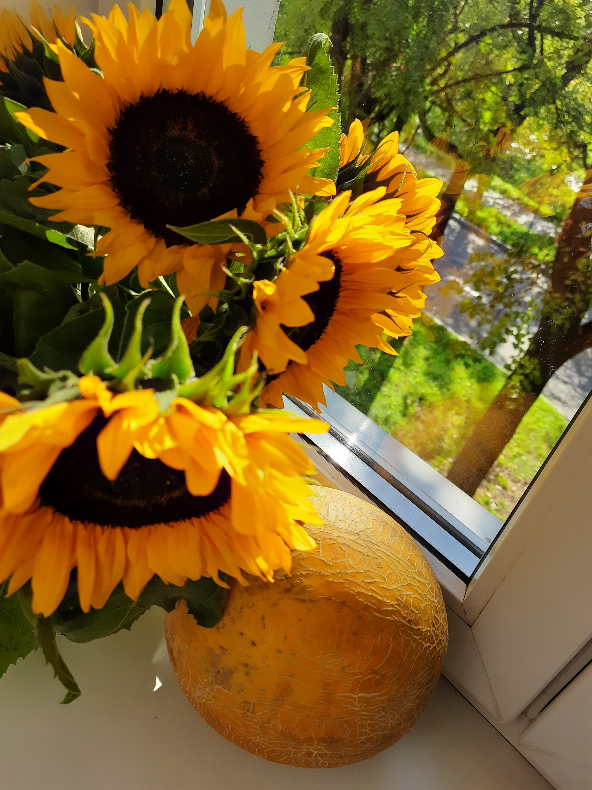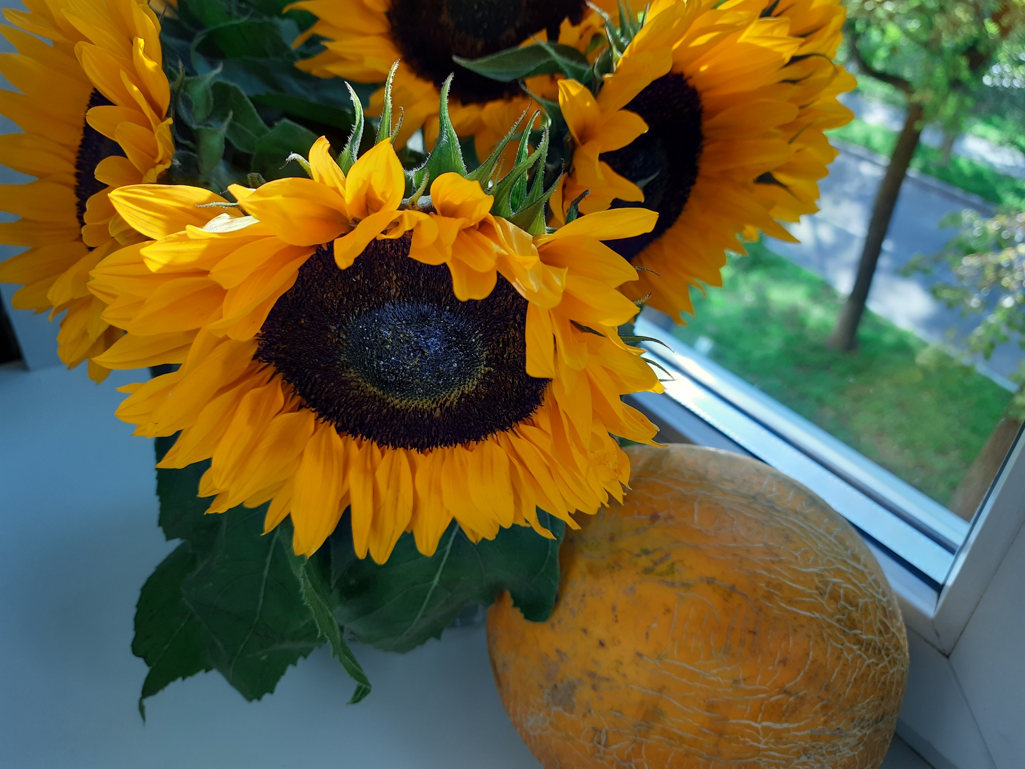 А подсолнухи манят. И погода за окном - настоящее бабье лето. Солнечно, небо синее.