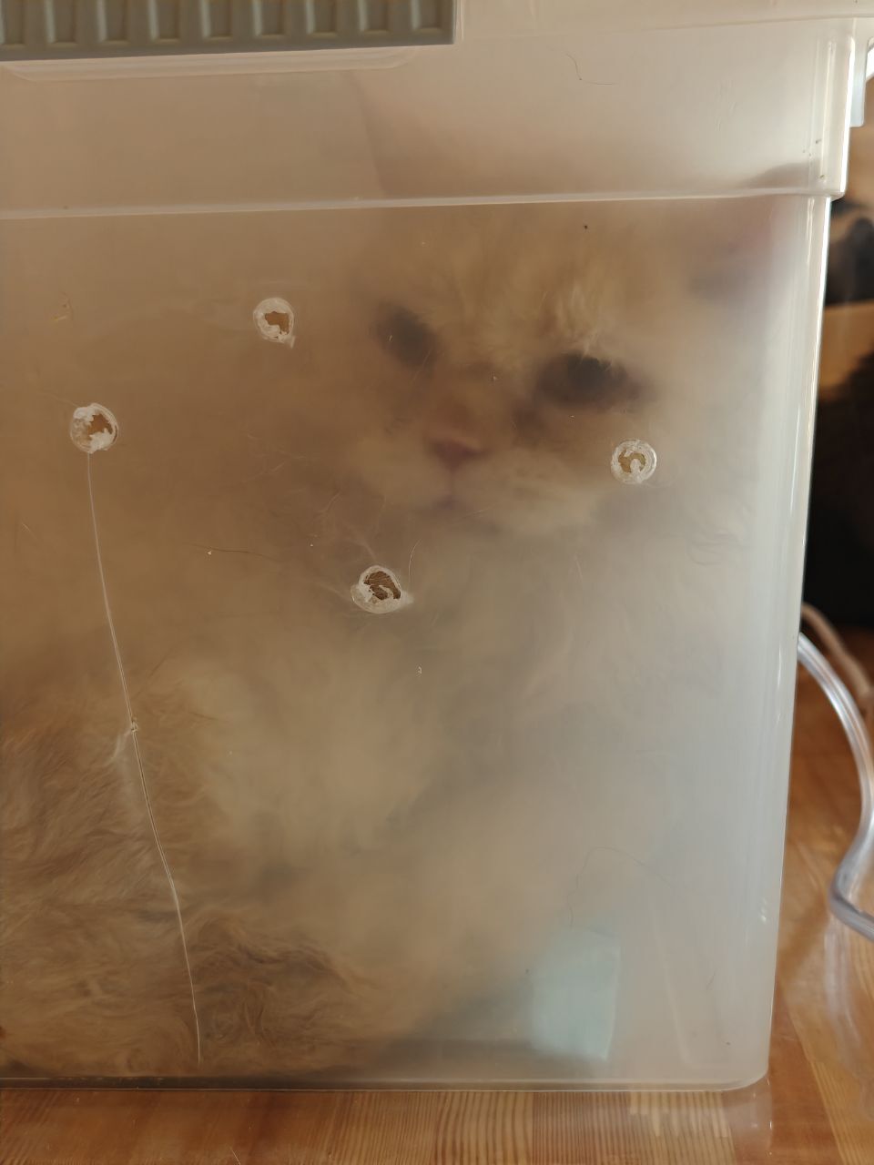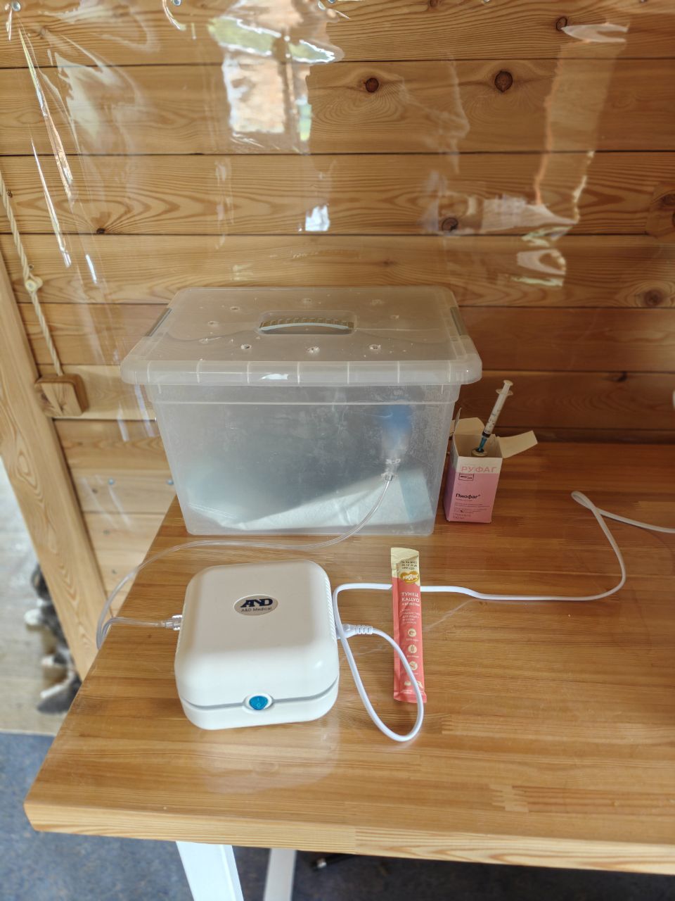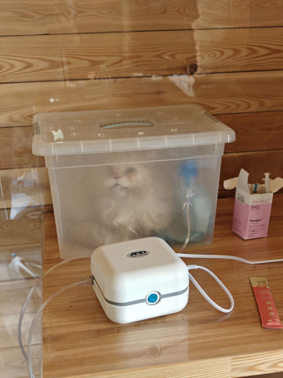 Всем привет. Я нашла у себя хороший контейнер с крышкой, сделала держатель для небулайзера внутри плюс дырки по всей крышке. Теперь я могу сделать кучу делать в то время, как коты лечатся. Это супер мега удобно. Перед тем, как посадить их туда, я даю им вкусняшку. На выходе тоже. Поэтому они ведут себя очень спокойно. Плюс, на полу бокса лежит пеленка