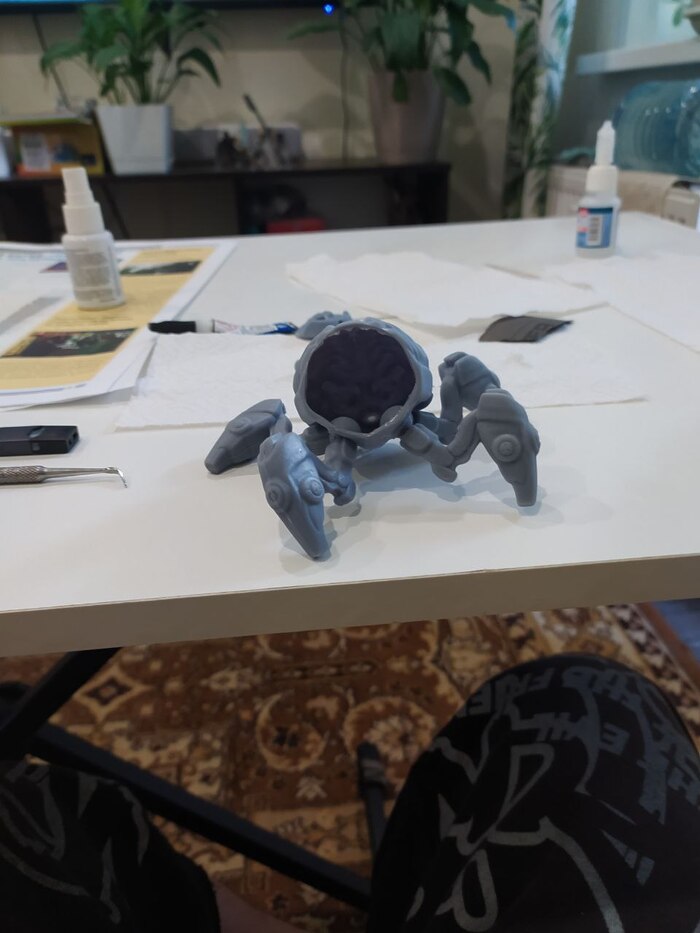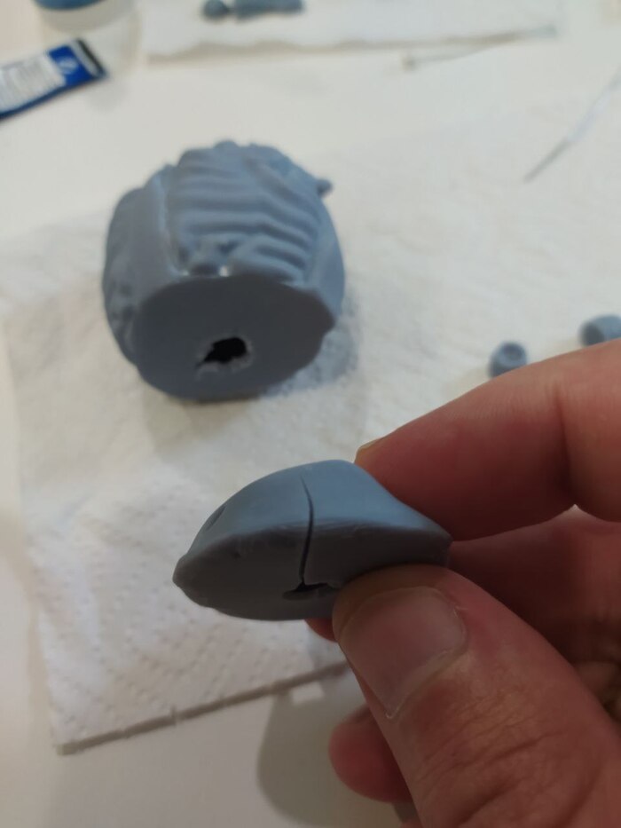 На самом деле нет. Просто опять получилась выпуклая хрень. Ну раз так, то удаляем. Тут же примерил склееные лапы. Клеил на цианокрилат, а щели заливал старым фотополимером и засвечивал фонариком. На будущее себе: - Не делай так, хрень выходит. Только ямочки так можно фиксить!!