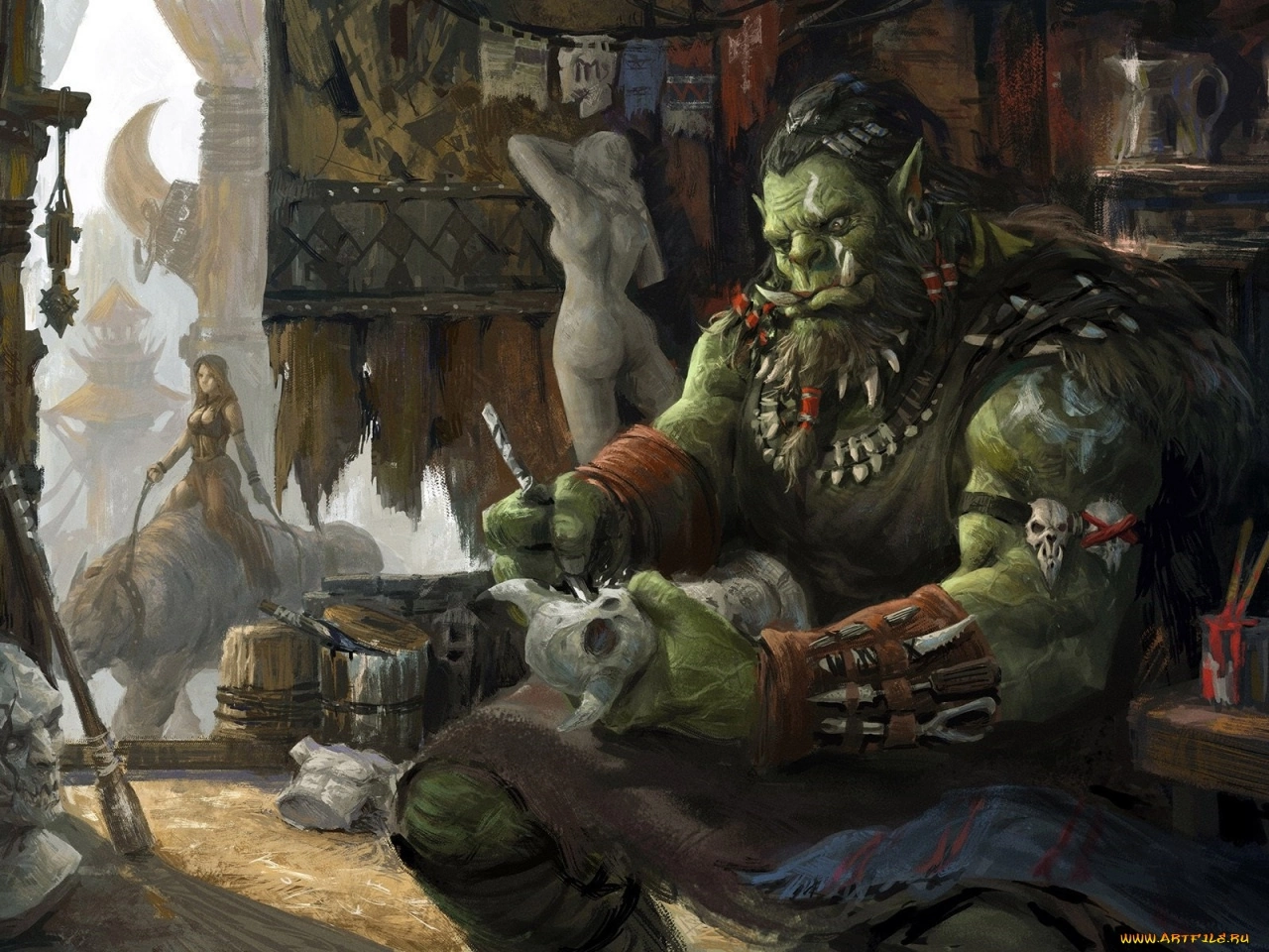 - Ммм? – Грог поднял взгляд в сторону шума, исподлобья взгляд его казался полным злобы, что его отвлекли от любимого занятия, но на самом деле он был просто удивлен, к нему редко кто-то заходил в шатер. Обычно орали с улицы чтобы он вышел, потому что его дом был и мастерской и жилищем одновременно и каменной крошки там было немерено. Увидев голову в проходе и испуганный взгляд девушки, а судя по тонким чертам это была именно девушка он попытался улыбнуться. Его и не без того выступающие клыки начали выпирать еще сильнее, голова в проходе икнула от страха, закатила глаза и начала заваливаться в шатер вместе с обмякшим телом. «Обморок» - подумал Грог – «Ну вот морока и что ей вообще здесь понадобилось…». Отложив в сторону инструменты он поставил не доточенную фигурку лютоволка которую хотел подарить соседскому ребенку на день воззвания, черпнул воды из бочки. Подойдя к девушке перевернул ее на спину и брызнул немного в лицо. От капель воды мускулы на лице девушки дернулись и она открыла глаза.