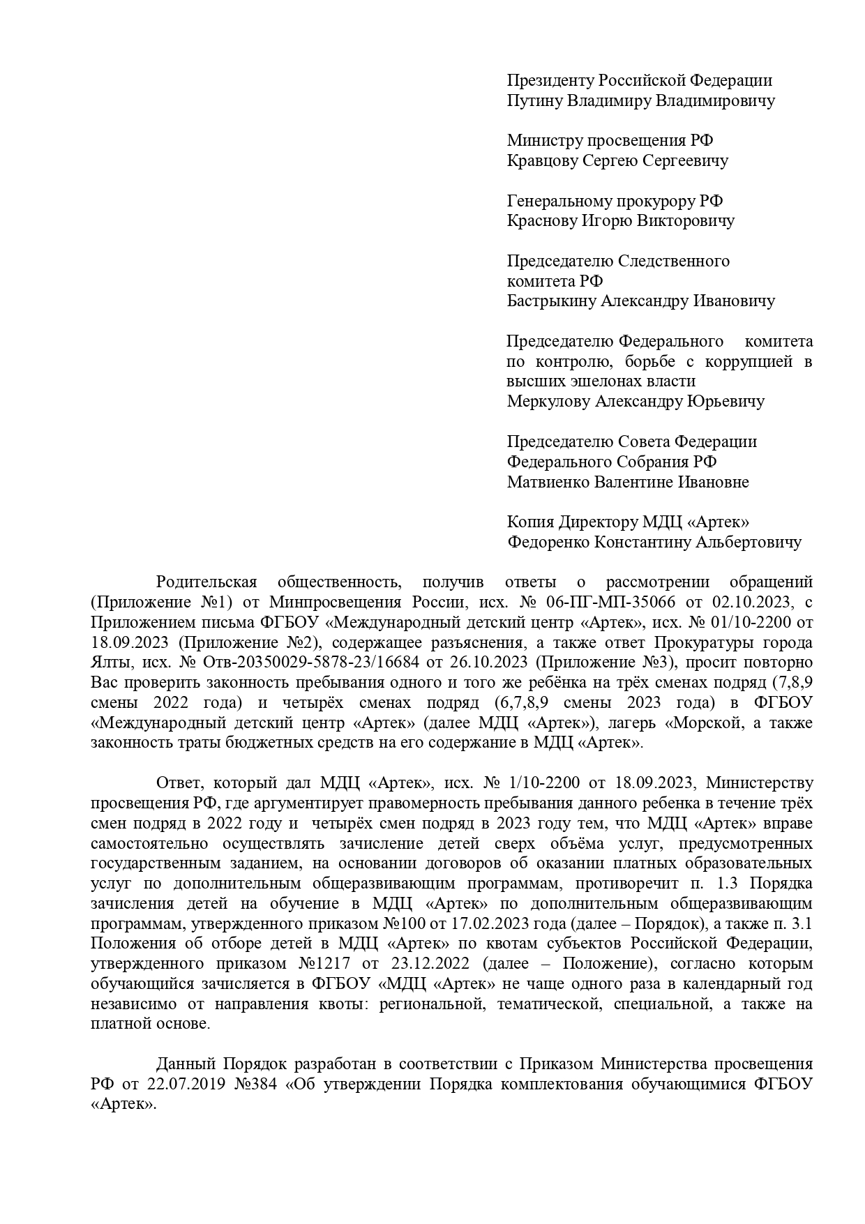 Новая жалоба подписанная группой родителей из 119 человек: