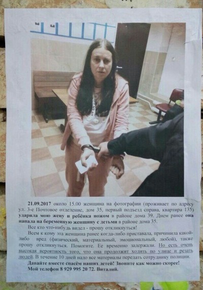 Эту ненормальную женщину задержали, положили в психушку под ремни. Орёт, мол любит детей, обожает и всё-такое. Муж пострадавшей настроен серьёзно и отступать не намерен. В этот же день он полез в кусты под окна сумасшедшей и нашел там кухонный нож, которым было совершено преступление, и рядом Библию (возможно совпадение, а возможно и нет). Полиция, сейчас внимание, ПОНАЧАЛУ НЕ ХОТЕЛА БРАТЬ НОЖ, ДАЖЕ КАК УЛИКУ. Но, опять же, благодаря мужу пострадавшей, настоявшим на то, чтобы нож всё-таки взяли (Да! Полиция не хотела брать улики! Это что вообще происходит?! Если бы не он, то возможно и дело бы замяли!), орудие преступления было внесено в число улик. Я, честно говоря, восхищаюсь этим мужчиной. На следующий день он пошел расклеивать листовки с просьбой свидетелей написать заявление в полицию. (увы, мне не удалось прочитать текст данных листовок, так как кто-то НАМЕРЕННО сорвал данные листовки со всех подъездов, на которых они были расклеены, но по рассказам знакомых там была фотография преступницы, описание произошедшего, и номер, по которому можно было позвонить в случае возникновения каких-либо вопросов). Как я знаю, он еще обходил квартиры, опять же с такой же целью.