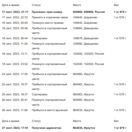 В том посте все закончилось хорошо (в комментах), оставалось только дождаться посылки по почте РФ. Сегодня "дождался" получив статус трека "Получено адресатом 27 сентября 2023, 17:01 664035, Иркутск" Но я проживаю в другой части Евразии и посылки не получал. Перед этим пришла смс с кодом подтверждения для получения и почти сразу "Отправление выдано получателю". На звонок по горячей линии почтаРФ отвечает робот, который тупит и ничего не удалось выяснить. Адрес указывал верно, свое почтовое отделение. Кароче налюбилово от продавца, придется открывать спор и пытаться возвратить 300р.