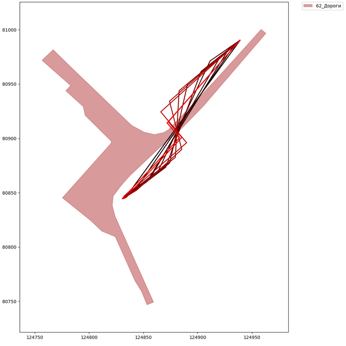 На рисунке изображена эволюция перехода через дорогу. Исходная особь – прямая линия – чёрного цвета. Разными цветами от чёрного к красному показаны лучшие особи свои поколений (с прореживанием поколений, иначе бы ничего не было видно).