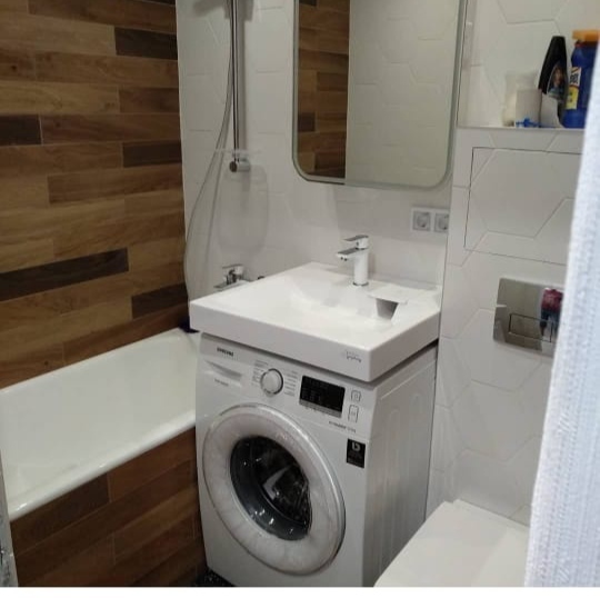 С ванной комнатой долго ломали голову, т.к. нужно было уместить машинку. Решили убрать ванну, т.к. она всё равно сидячая, а мы в основном душ принимаем. Стиралку поставили под акриловую столешницу, на всю ширину люк машинки не открывается, но меня в принципе устраивает, постельное белье нормально достаётся. В углу сделали душевой уголок (размер по сторонам - 90). В общем всё поместилось, но в большим трудом и не всё как надо (это я про машинку).