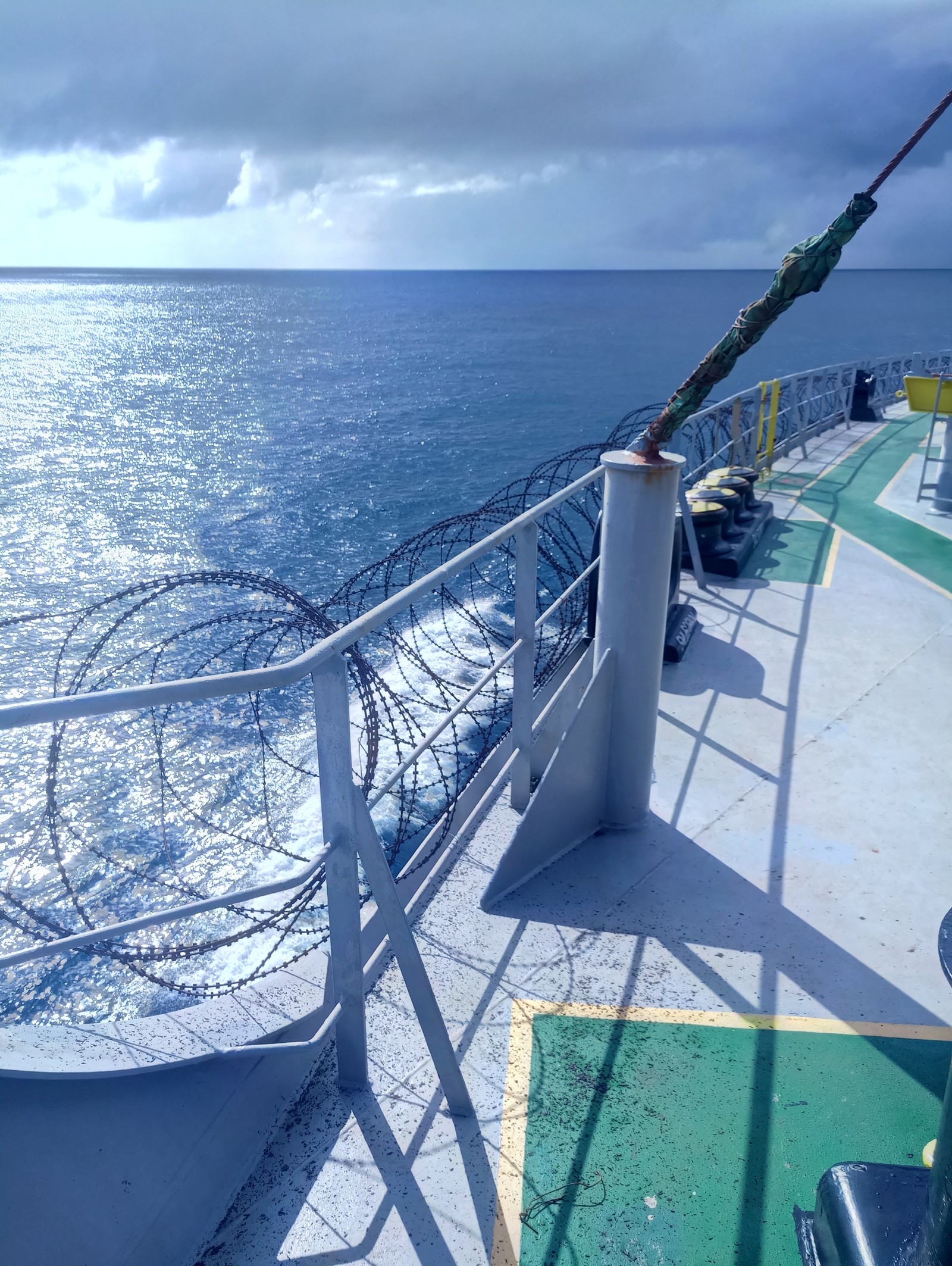 Как и писали в коментах к прошлому посту - по периметру натягивают колючую проволоку, ставят пожарные шланги в местах, где чаще всего пытаются зацепиться пираты, закрывают все пути входа в надстройку и у нас ещё были решётки на иллюминаторы