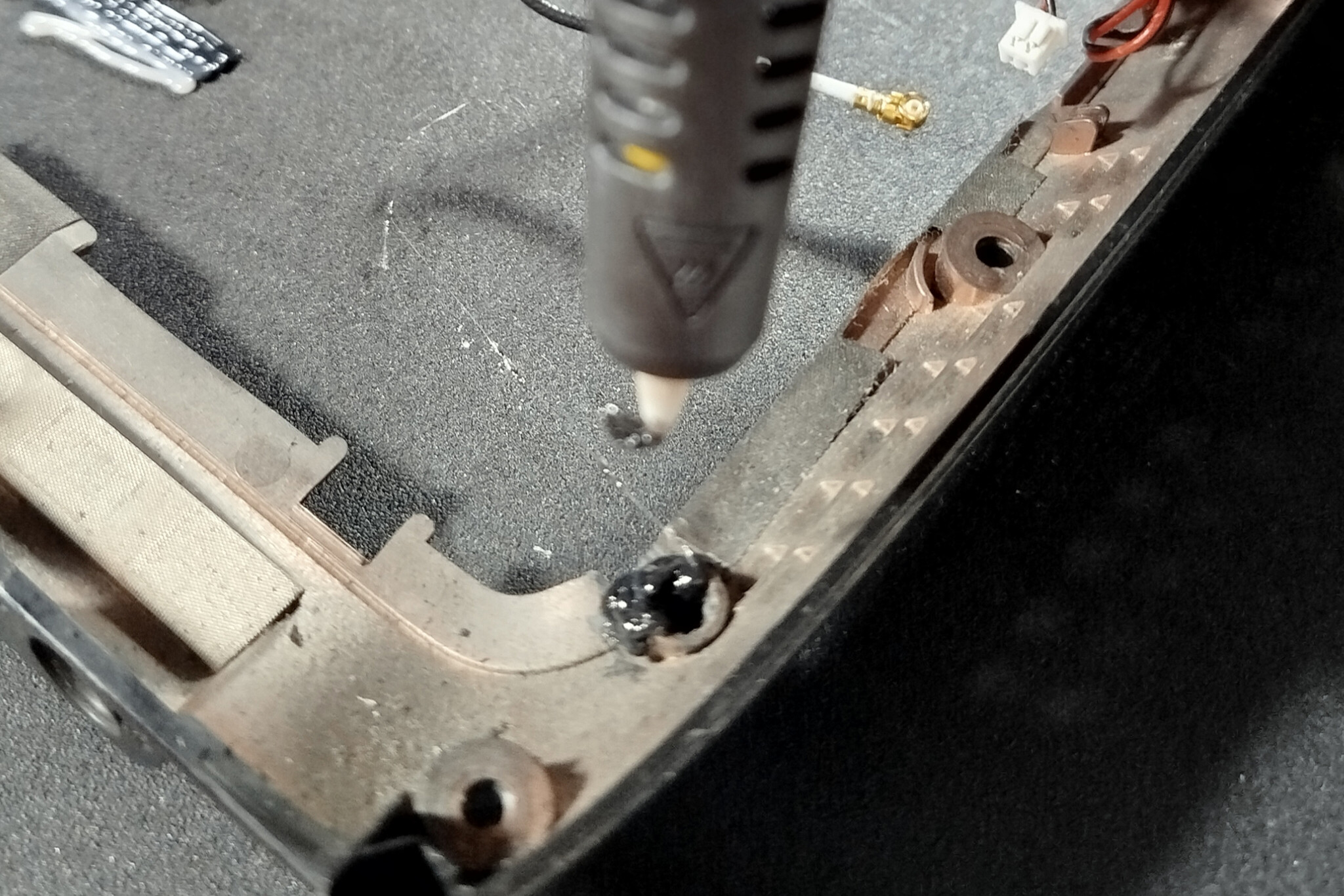 Насрал от души сверху пластика - уже держится крепко. Но материнскую плату ноутбука на эту срань уже не закрепить, поэтому в ход пошел паяльник:
