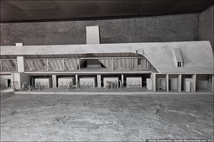 Модель газовой камеры и крематория II Аушвиц-Биркенау. Людей убеждали в том, что их отправляют в баню, поэтому они выглядят относительно спокойными.